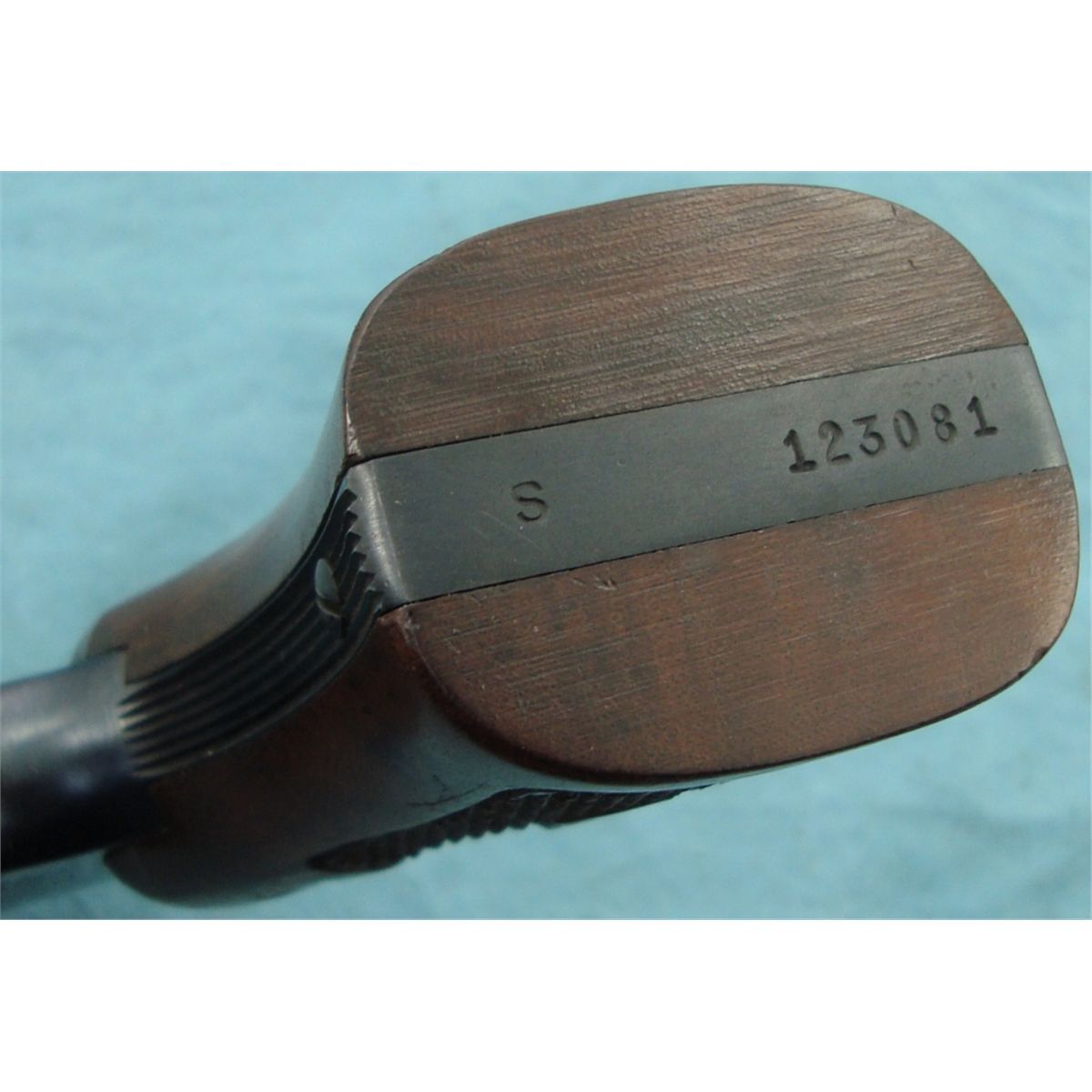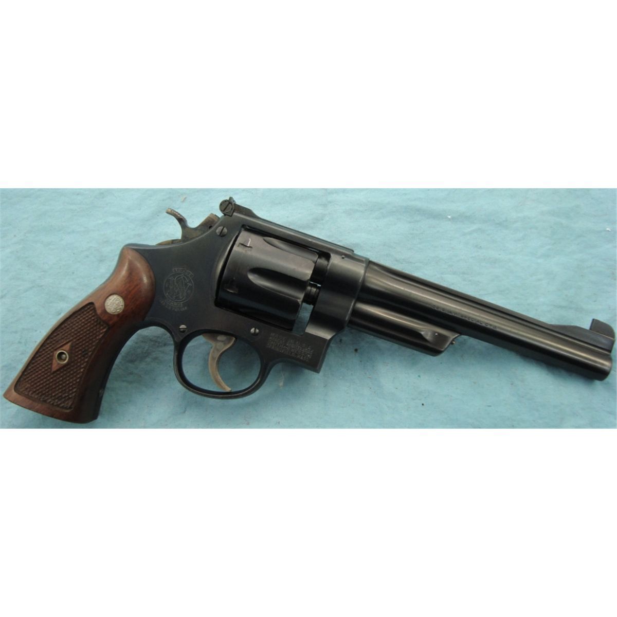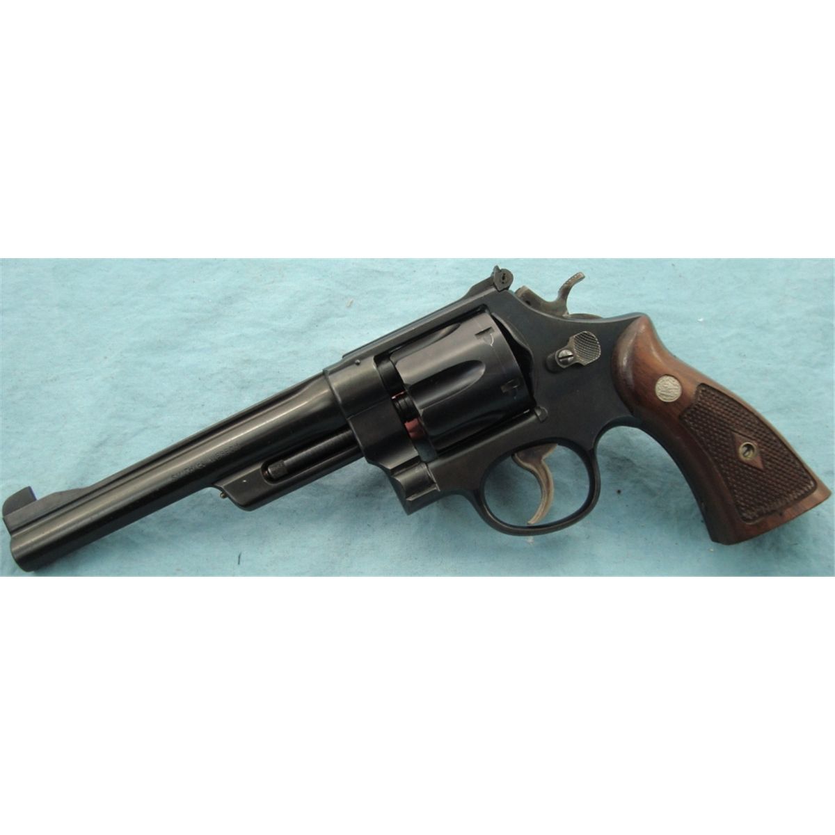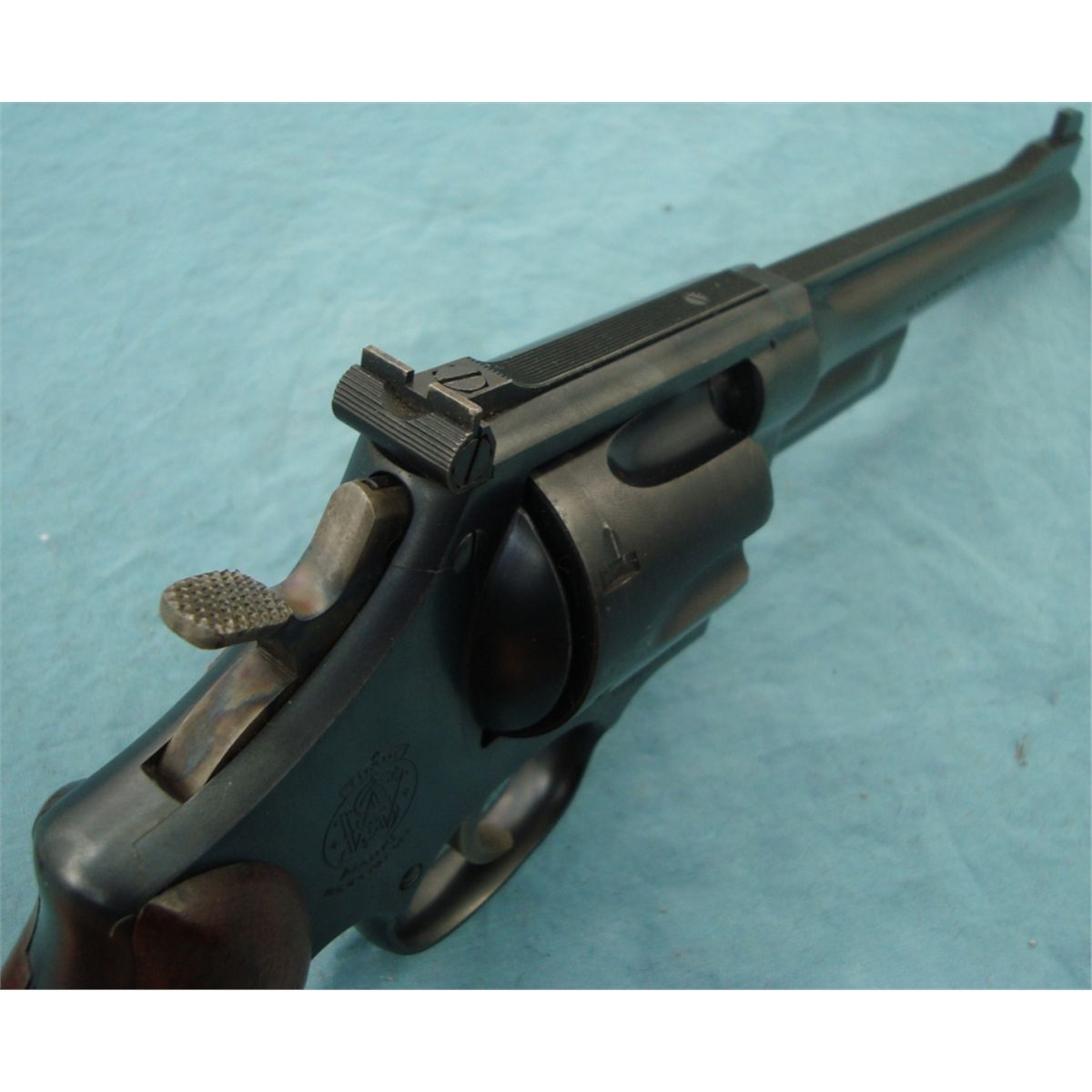 #S123081; 38 S&W Spc. w/6 1/2" bbl. & rear adj. sight & partidge front. Blued finish w/case colored trigger & hammer. Checkered S&W walnut grips w/grooved back strap. Very good lightly used condition w/some minor marks from use & storage. Overall a very nice Pre-Model 20 Revolver.