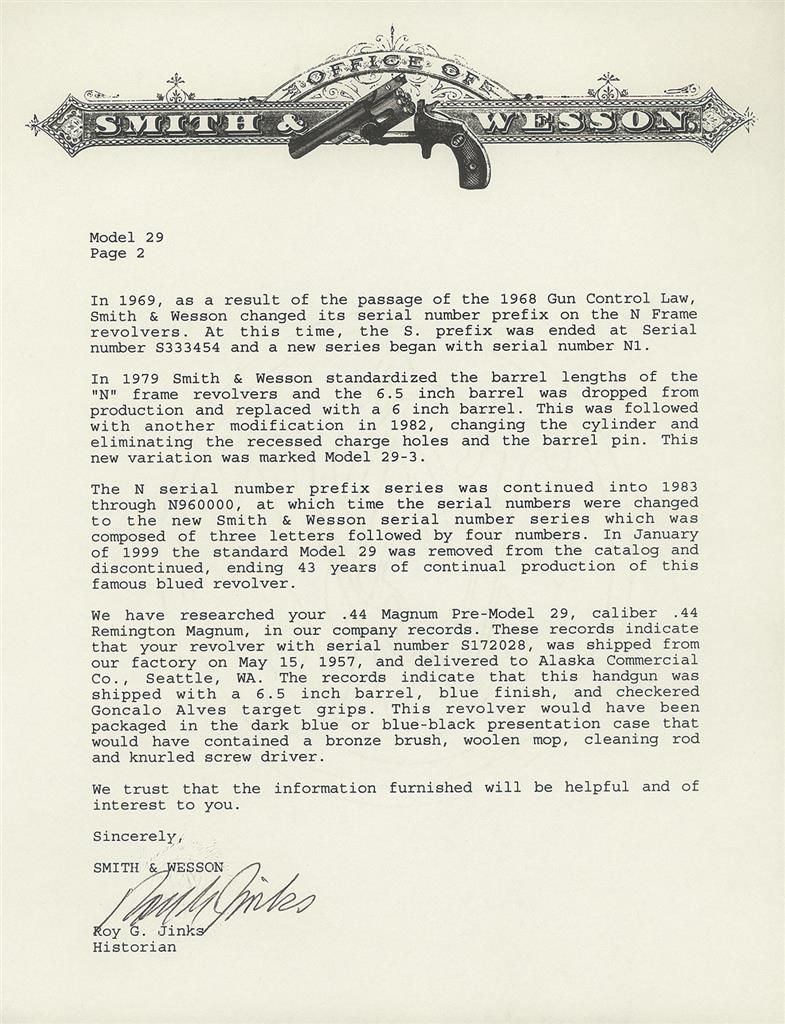 With factory case numbered to another gun and factory letter that verifies barrel length, finish, and grips. Shipped May 15, 1957 to Alaska Commercial Co., Seattle, WA.