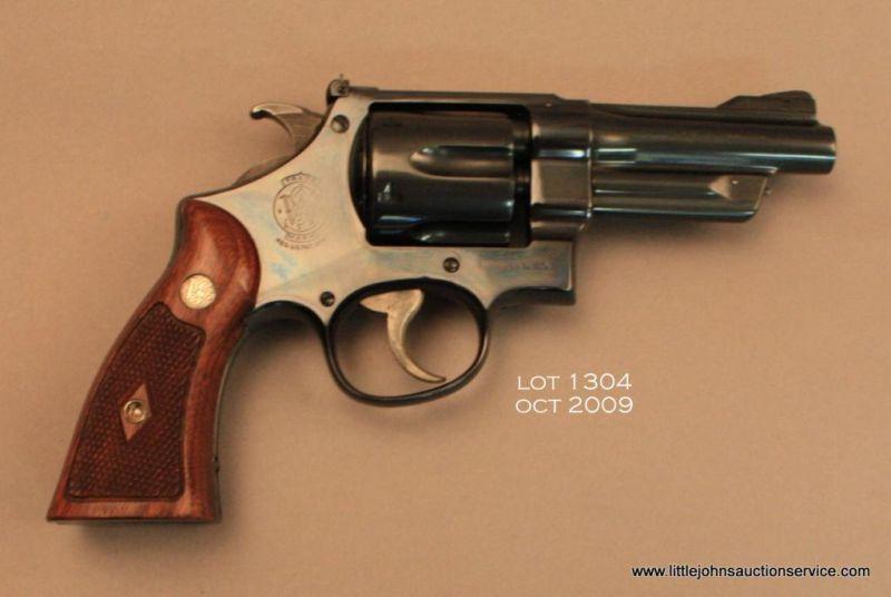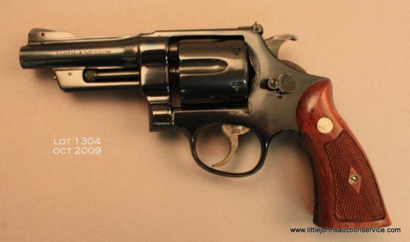 Smith & Wesson Registered Model DA revolver, .357 Magnum cal., 4” barrel, blue finish, checkered medallion wood grips, #59765. This gun is in overall excellent condition. It may well have been returned to the factory for work as the numbers“27” have been stamped into the crane, one over the Reg. 5177 and one under the crane #43889. The gun has a King front sight, checkered top strap, classic Registered Model style swept back hammer and the grips are in excellent condition. The bore is fine, the action crisp and the markings are sharp and if there was a refinish to parts of this gun, the weapon was in excellent condition when it was originally returned for work. Most importantly, a factory letter accompanies this gun with concluding information "...your handgun, with serial number 59765 Reg. NO 5177, was shipped from our factory on Sept. 7, 1939, and delivered to Kansas City Police Dept., Kansas City, MO." The letter also confirms the barrel length, BaughmanQuick Draw front sight on a King Ramp Base, square notch rear sight, blue finish and checkered walnut magna grips. The shipment contained 250 units with registration numbers 4987 through 5236, Records also noted the revolver was returned to
