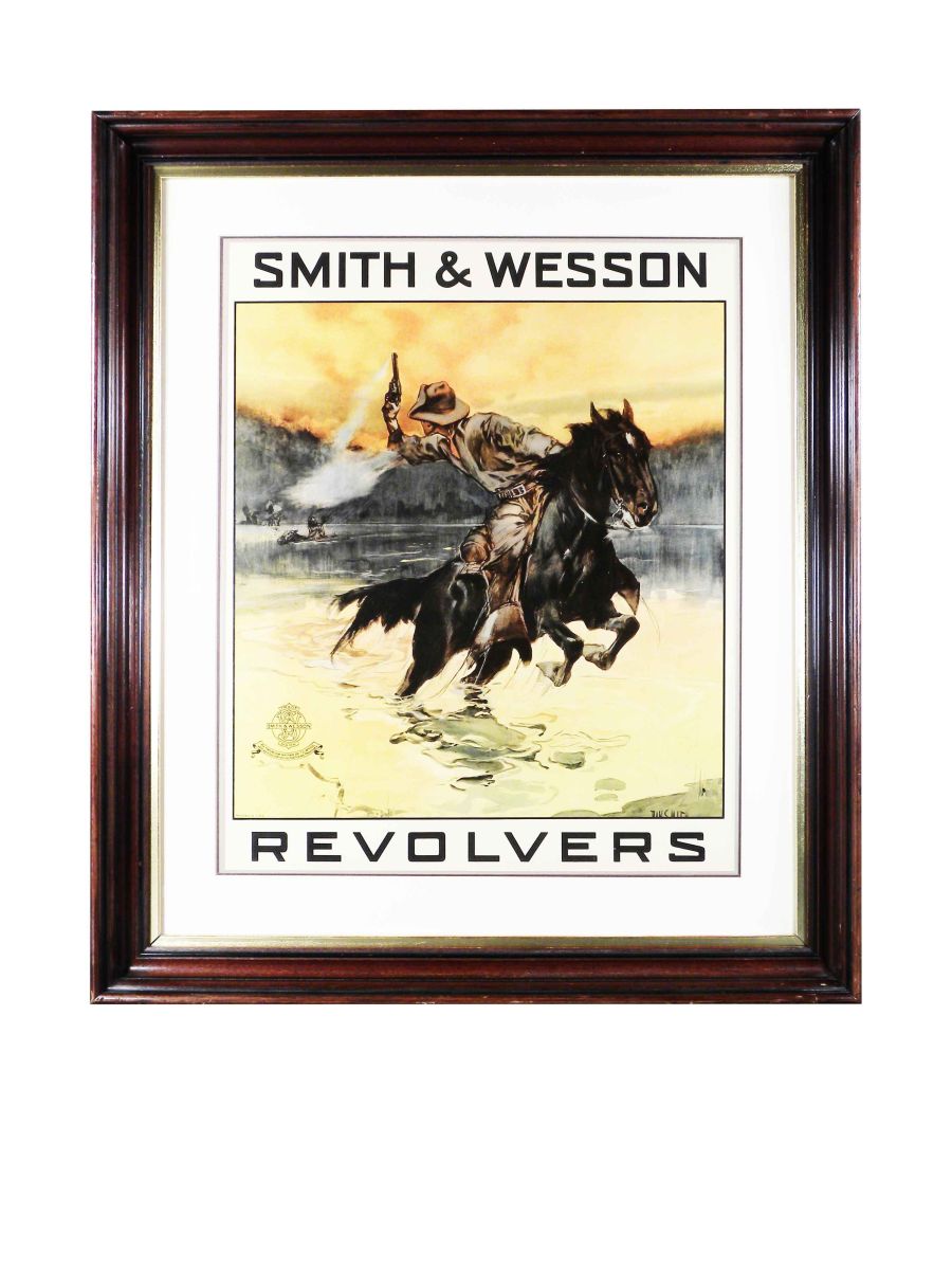 Smith & Wesson Revolvers Paper Sign. Excellent condition, framed under glass. 18 X 22 inches image only.