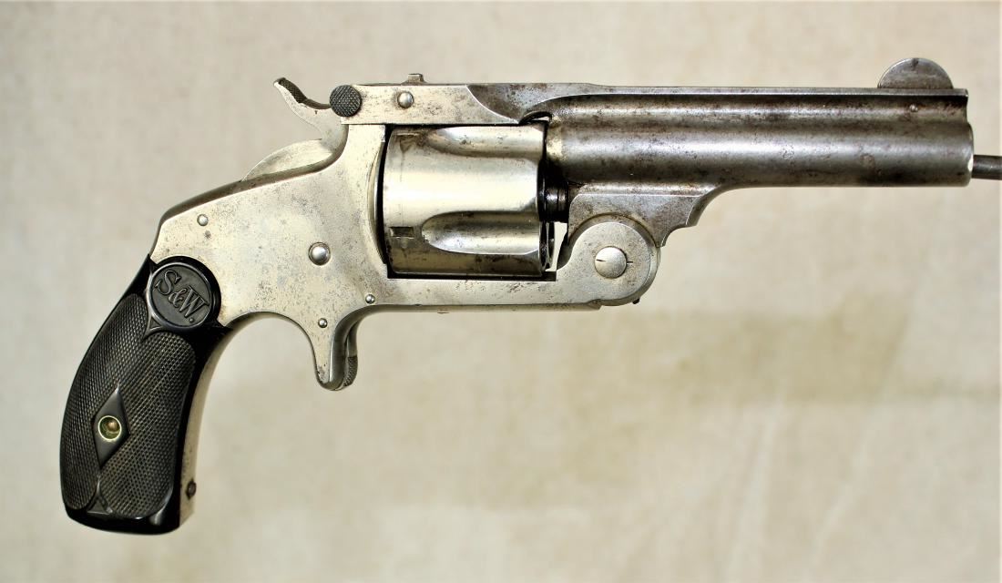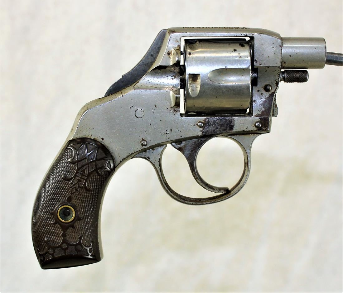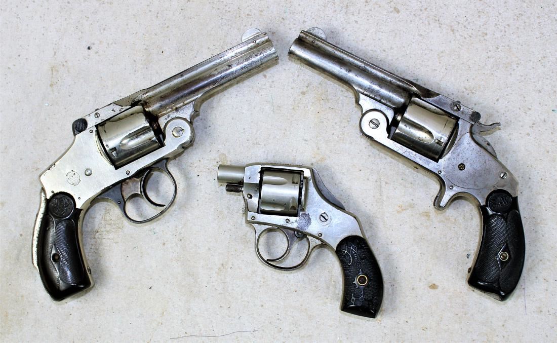 Grouping of three pocket revolvers including; 1) Smith & Wesson double action in 32 caliber 2) Smith & Wesson single action in 32 caliber, and 3) Vest Pocket snub nose 22 caliber.