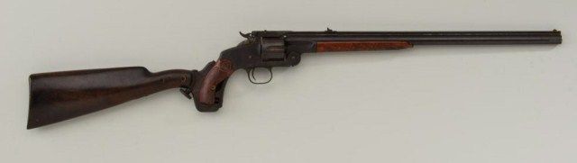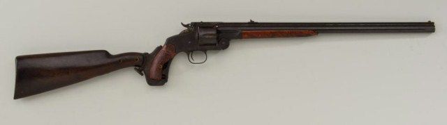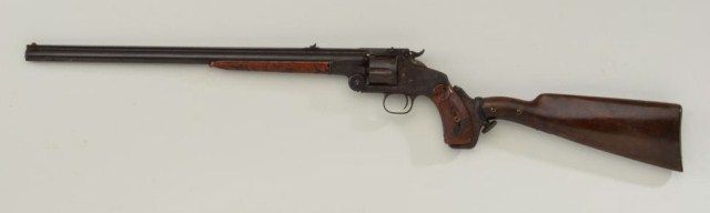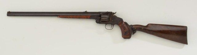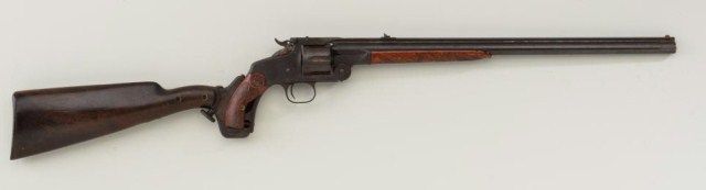 Smith & Wesson Revolving Rifle based on No. 3 single action design in .320 caliber with 18” barrel and original shoulder stock in its period canvas covered case. The revolver is in “out of the attic” condition showingconsiderable blue mixed with a brown patina with some erosion and light pitting, much of which may clean. The edges are fairly sharp, the barrel address is good. The original sights are retained. The bore is bright andnear excellent. The mottled red colored stocks are very good other than the right grip which 1/3 has broken away and is missing. The action is cocking but not locking and out of time. The back of thehammer shows case hardening and the fore end is crisp with logo on bottom. The original shoulder stock shows matching metal and very good wood with correct butt plate. The case has lost its partitions and the lining &exterior are both slightly rough. The serial numbers are not legible due to rust and pitting with only two digits legible (96). A definite restoration candidate as mint examples have fetched up to $100,000 just
