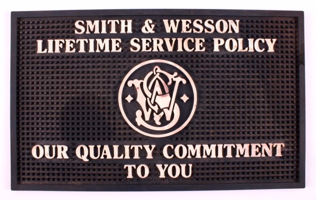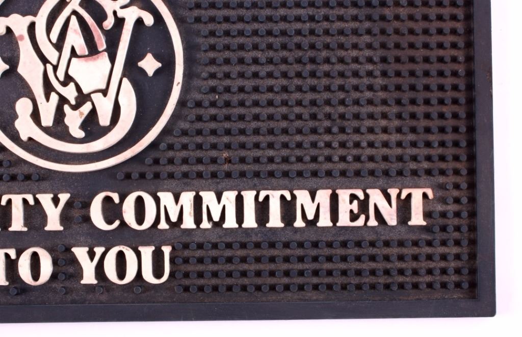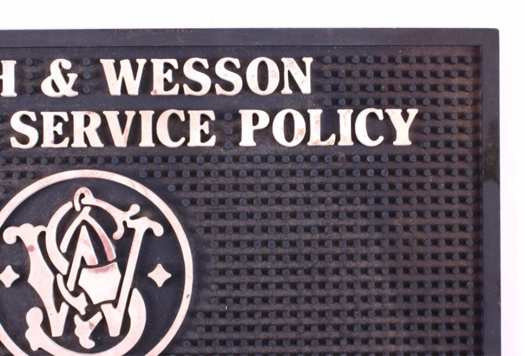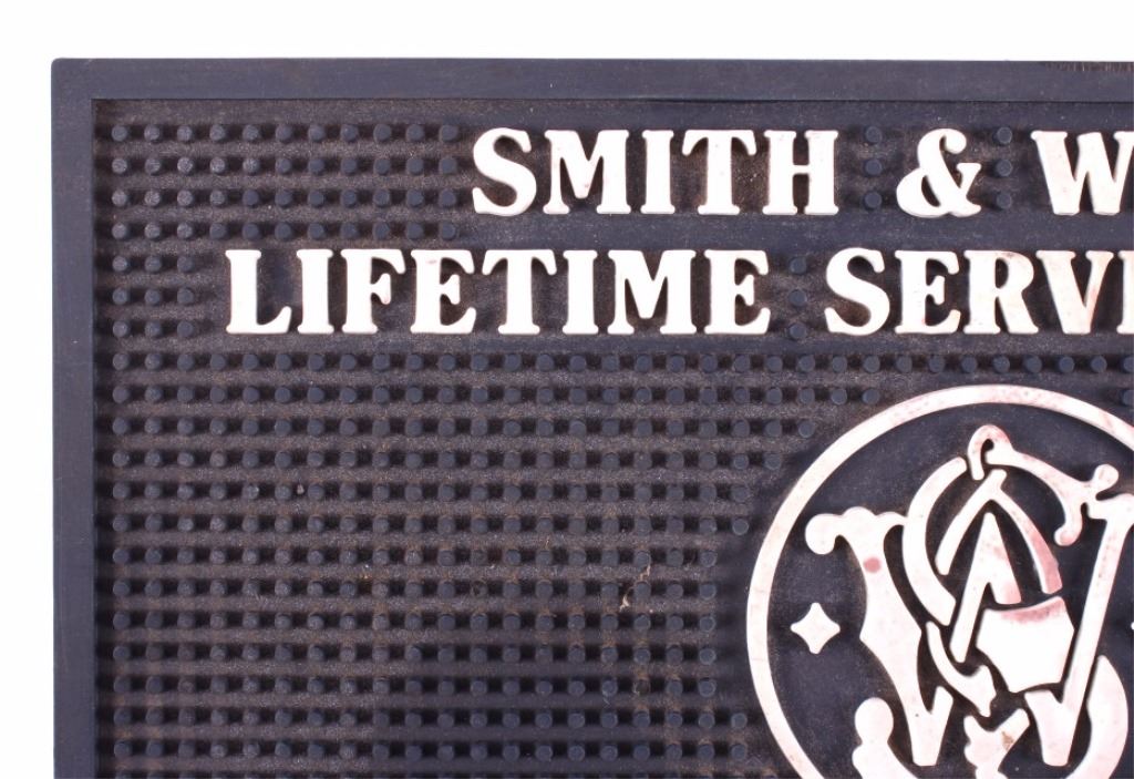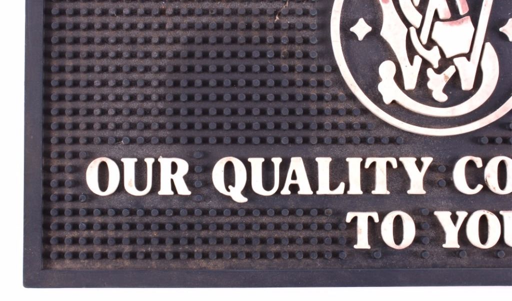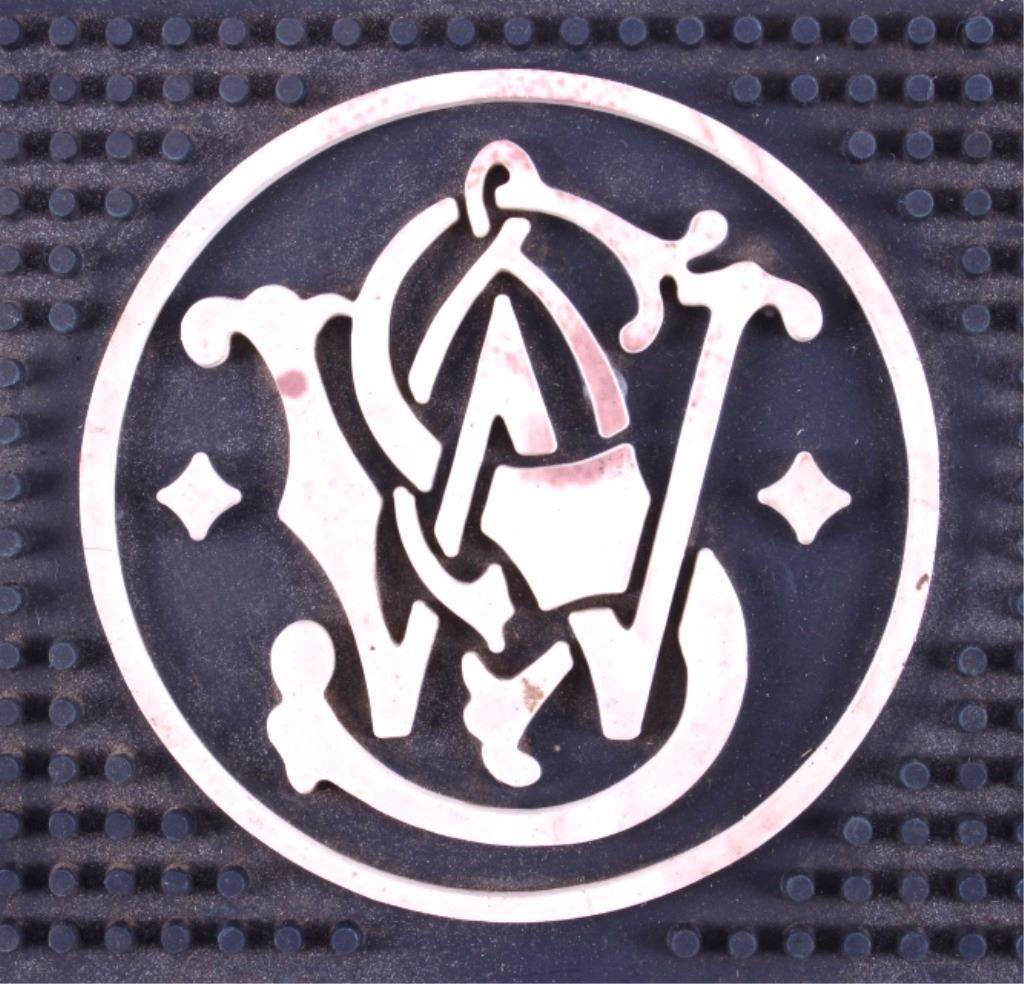 This is a Smith & Wesson rubber gun mat. The mat would be used in a gun shop for a salesman to set a gun on. The mat is marked with the Smith & Wesson logo. A great piece for any gun enthusiast. It is in good condition. The mat measures 9" x 14.5" .