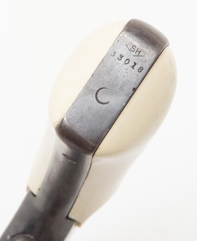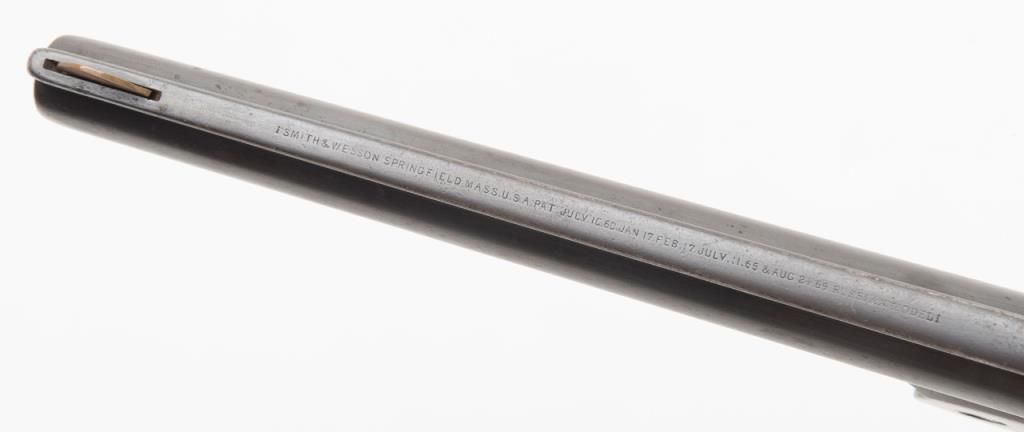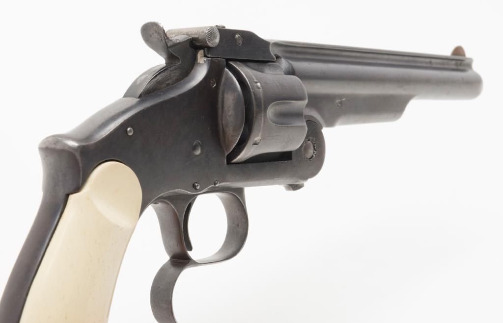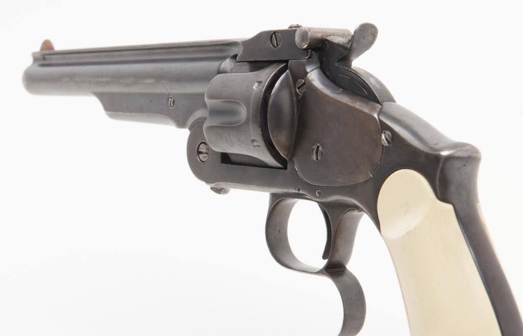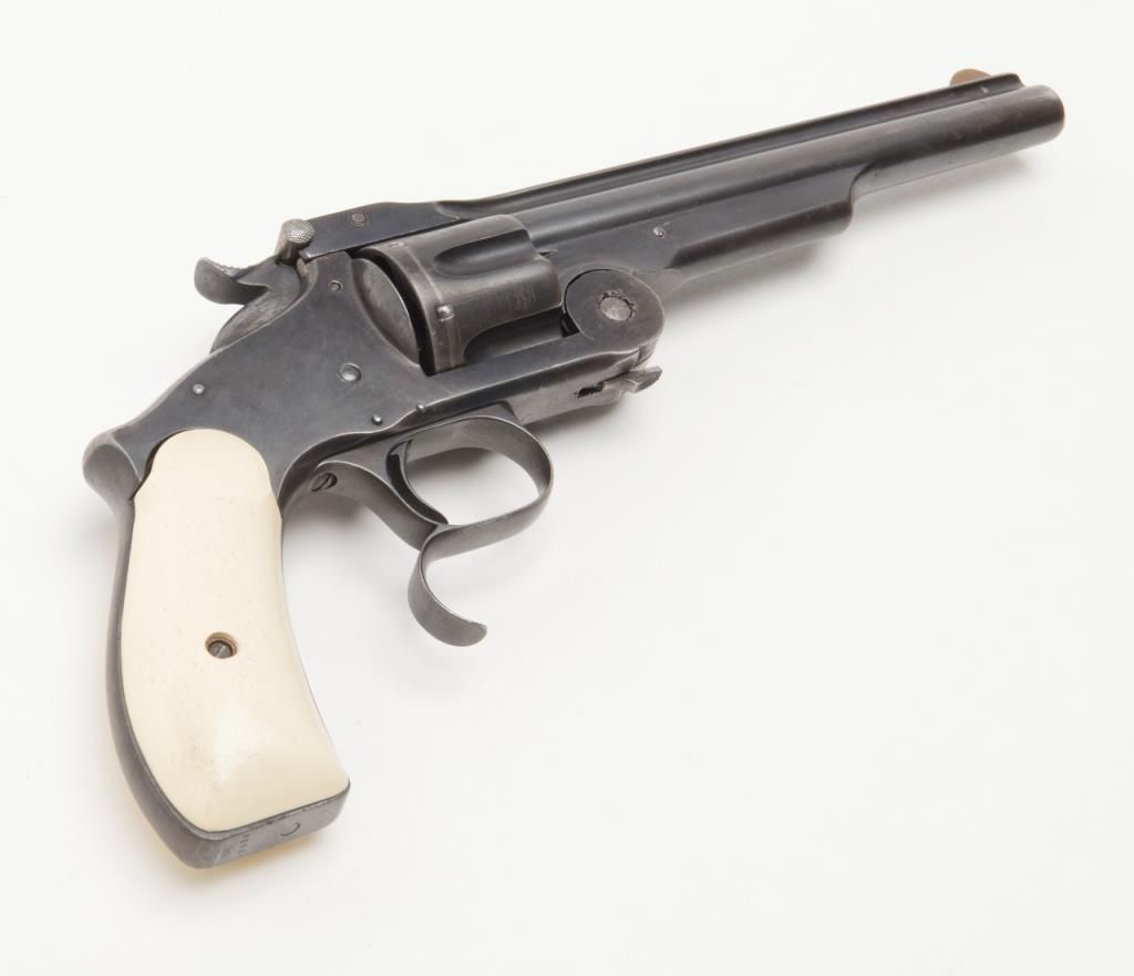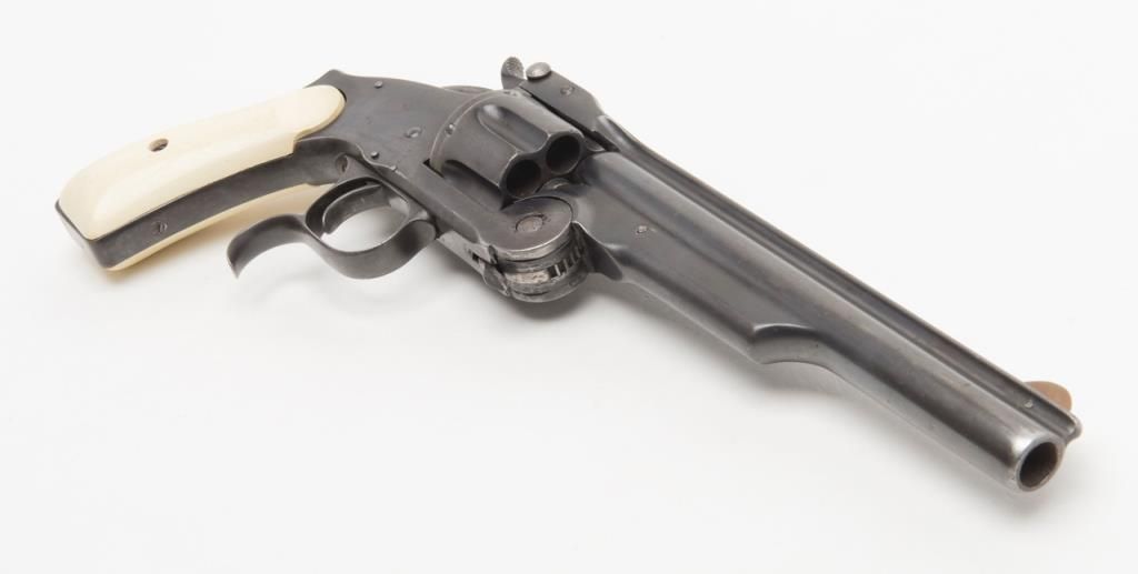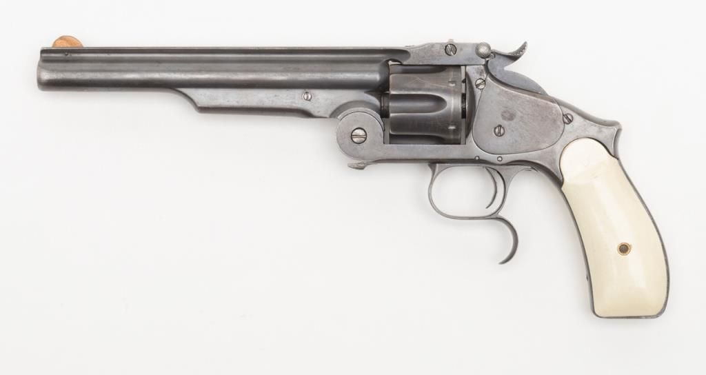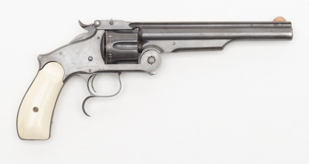Smith & Wesson Russian Second Model Commercial Single Action Top Break revolver, .44 Russian cal., 7” barrel, old re-blue finish, faux ivory grips, finger rest trigger guard, #33018 in overall good condition as re-finished, goodaction, fair to good bore, good markings and later grips; re-worked firing pin; replaced front sight. (Antique). Est.: $1,200-$1,800.