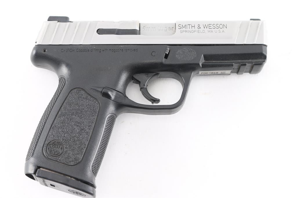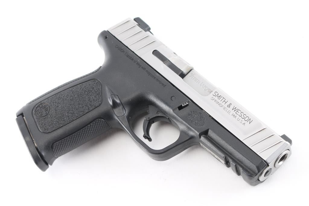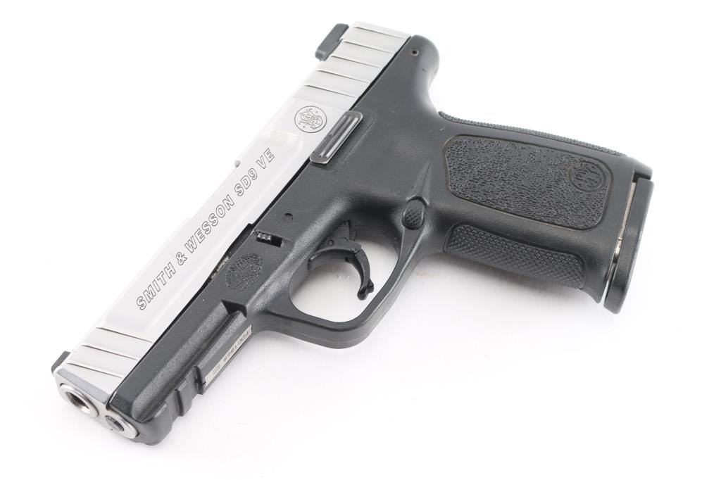 Self Defense 9mm Value Enhanced American made striker fired semi-automatic pistol chambered in 9x19mm. Features a matte finished stainless steel slide with fore & aft cocking serrations, dovetailed three-dot sights, 4" barrel with loaded chamber viewing port, integrated trigger safety, push button magazine release, factory 16 round magazine, and black polymer frame with integral accessory rail & textured grip. Pistol exhibits moderated handling wear with scattered scratches and scuffs. The action is sound, the bore is excellent and the polymer is good with wear.Condition is NRA Good to Very Good.***Modern Firearm***