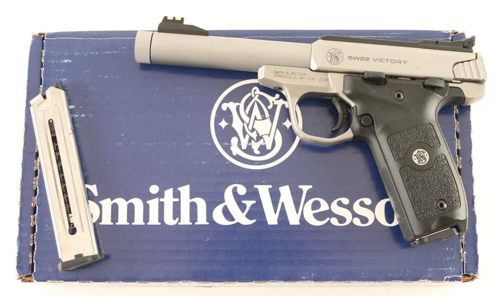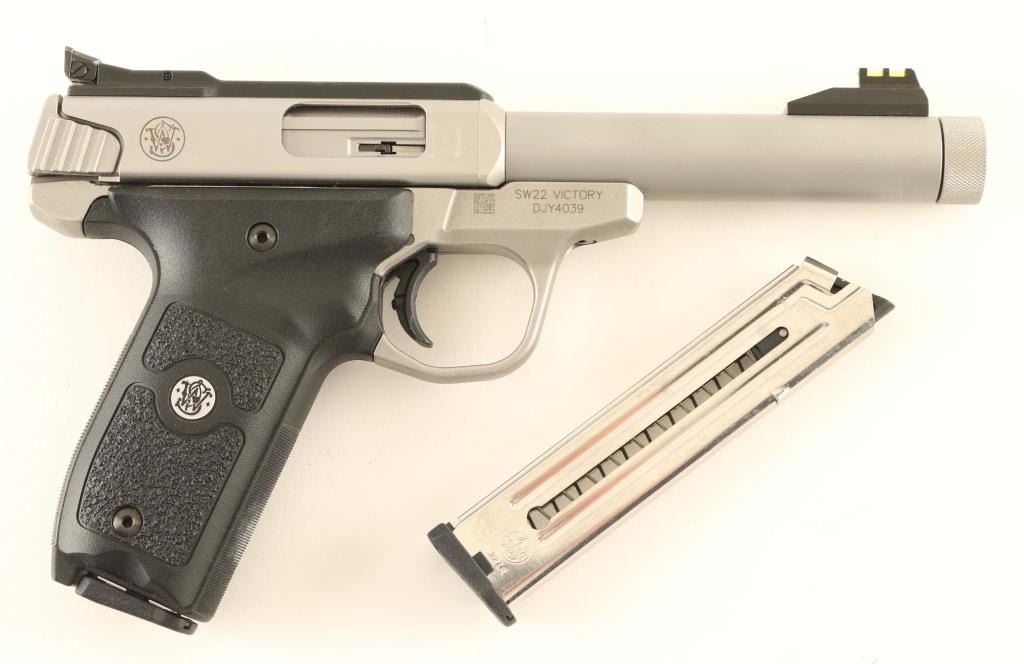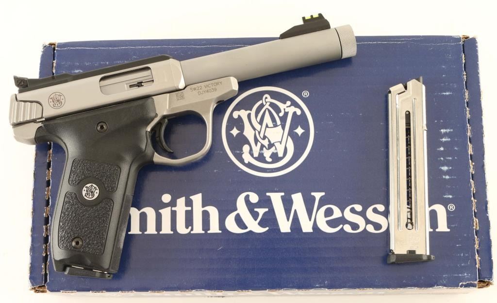 Semiautomatic pistol features 5,5" barrel with threaded muzzle, muzzle thread protector, adjustable sights with three dot fiber optic inserts, manual safety. Metal parts are matte stainless or a matching finish, grip frame is black polymer, sights are black in color. Bore is excellent. Overall external condition is Excellent, almost like new, with a few tiny dark spots on left side of upper receiver, several locations with rub marks. Includes factory cardboard box, two magazines, cable lock, polymer Picatinny type rail with mounting screws (appears to replace rear sight), manual. Condition is Excellent *** Modern Firearm ***
