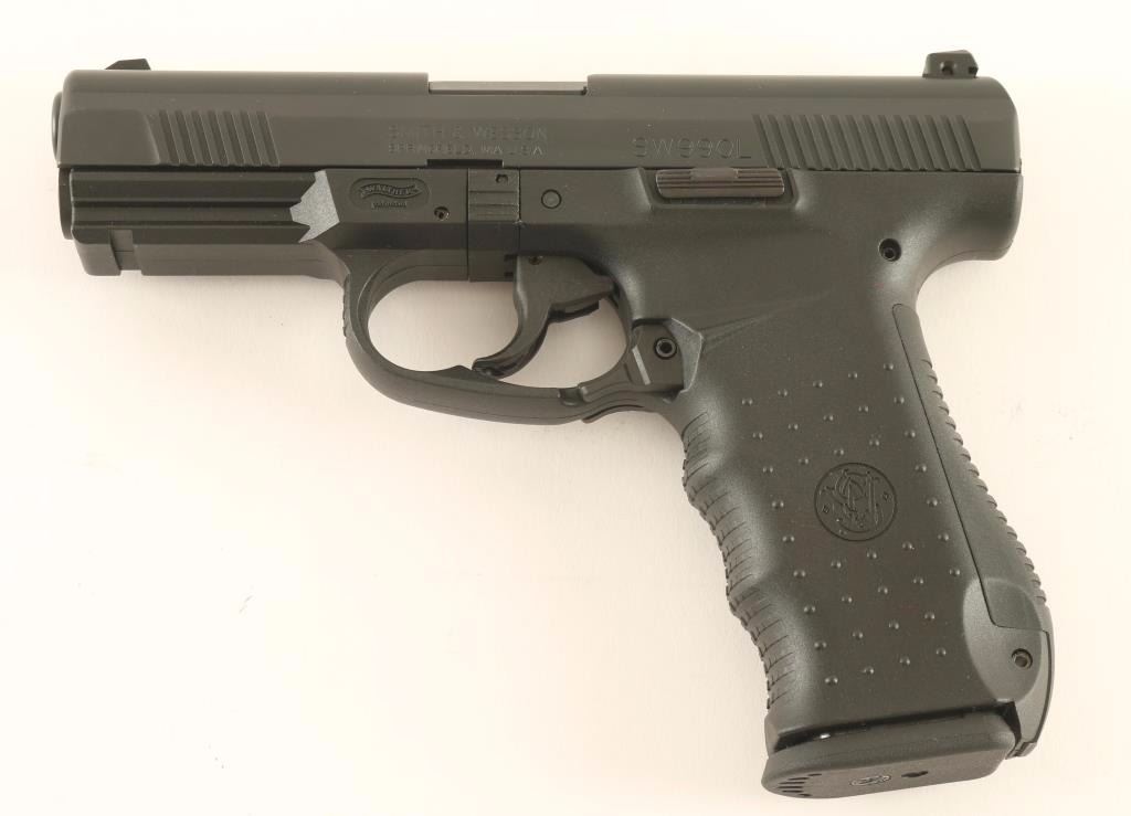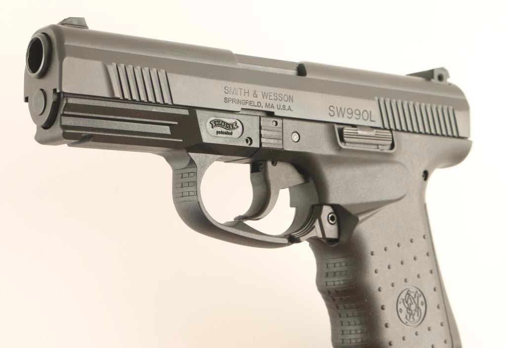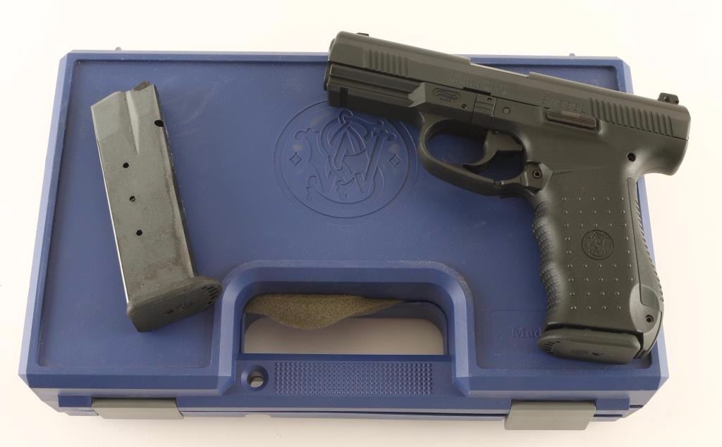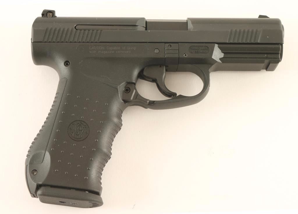 Walther/S&W hybrid striker fired semi-automatic pistol chambered in .45 Automatic, circa 2005. Features a black Melonite finish, 4.25" barrel, white dot patridge front sight, two-dot adjustable rear window sight, textured polymer trigger, ambidextrous paddle magazine release, 9 round factory magazine, cocked indicator, and German made black polymer frame with integral accessory rail, textured finger groove grip & interchangeable backstrap. Includes the original factory hard case with documents, spare front sights, spent case, lock, spare magazine and additional backstrap. Pistol exhibits very little wear. Action is strong, bore is pristine and polymer is fine. Condition is near new in case. ***Modern Firearm***