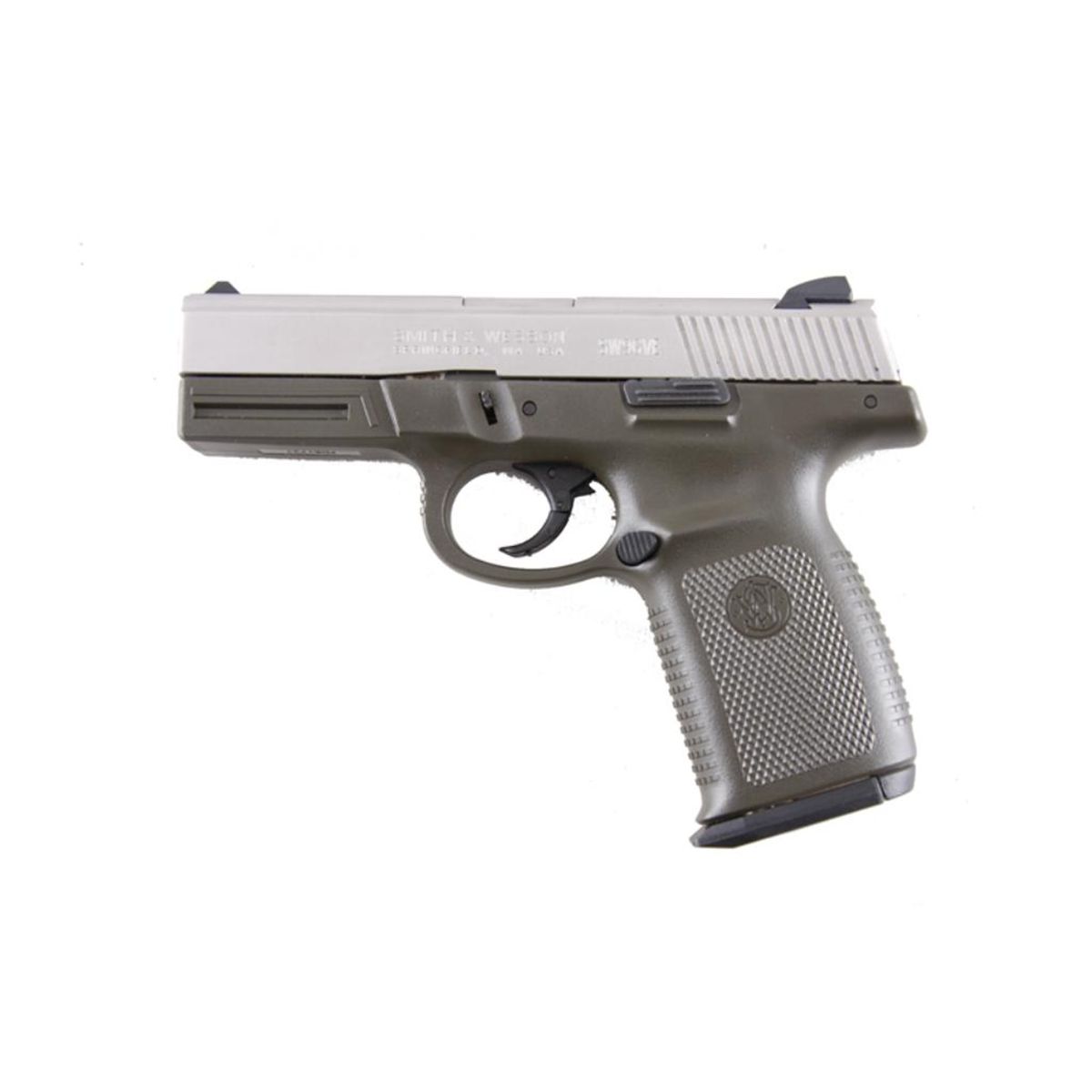 Smith & Wesson SW9GVE Cal 9mm SN:PDR1727 Double action semi-auto 16 round pistol with stainless steel slide and NATO green polymer frame. Green checkered grips molded in, 4" barrel with drift adjustable 3 white dot sights, accessory rail molded into theDouble action semi-auto 16 round pistol with stainless steel slide and NATO green polymer frame. Green checkered grips molded in, 4" barrel with drift adjustable 3 white dot sights, accessory rail molded into the framebelow the barrel, good bore and action. In blue carry case, numbered to the gun, with instructions, separate gun lock. Condition: Near new with little sign of use. 2 magazines.