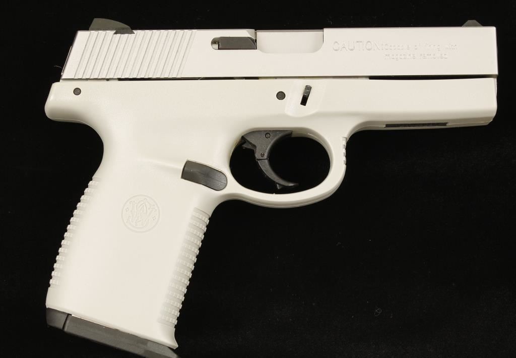 Stainless and polymer double-action only semi-automatic pistol with a 4" barrel and two 10-round magazines. Finish is impeccable. Bore is mirror bright with sharp rifling. Has two piece safety trigger with secondary sear. Function is good. Includes a factory plastic foam-lined case with empty chamber indicator and trigger block. Condition is excellent. *Modern Firearm*