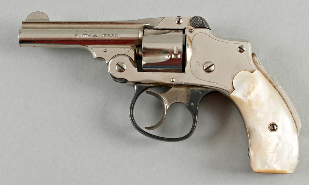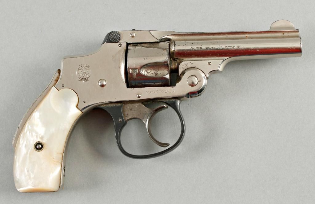 Smith & Wesson Safety 3rd Model Cal .32S&WSN: 237947, .32 Safety Hammerless "Lemon Squeezer" 3rd model, double action only, nickeled steel, blued steel action latch/ejector and trigger guard, round butt frame, grip safety, mother of pearl grips,fixed sights, 3" barrel, some plating loss showing oxidation/pin prick pitting in substrate, fair to good bore and good action. Condition: Good to very good.