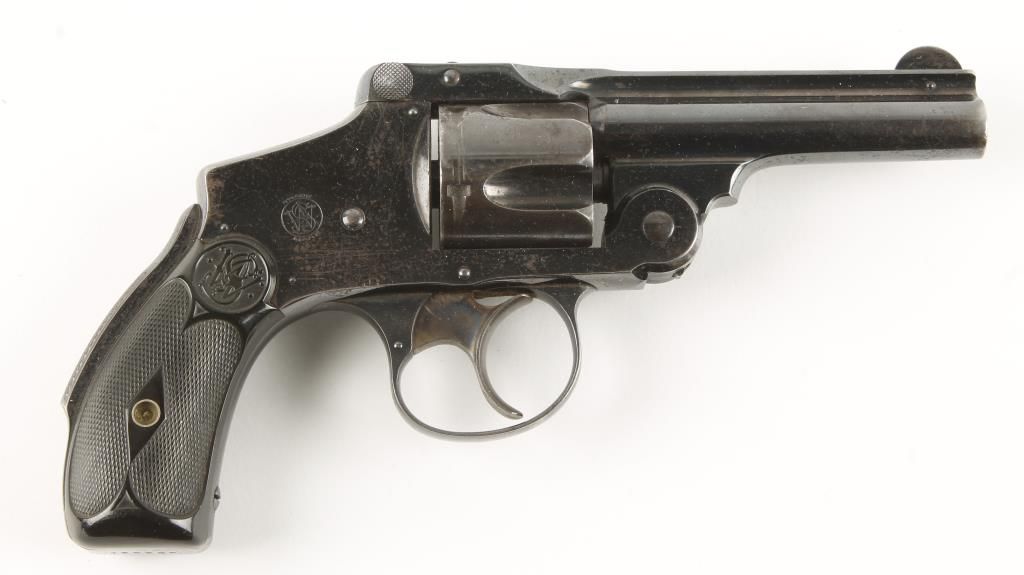 Double action hammerless 5 shot top break revolver made in early 1900's with 3-1/4" round solid rib barrel. Blued finish, case colored trigger, checkered black hard rubber grips with S&W monogram, grip safety and fixed sights. Good bore and action. Condition: Good showing 80% original finish, light pitting, good case coloring and grips are very good. *Curio & Relic Firearm*