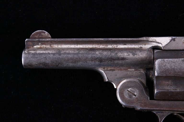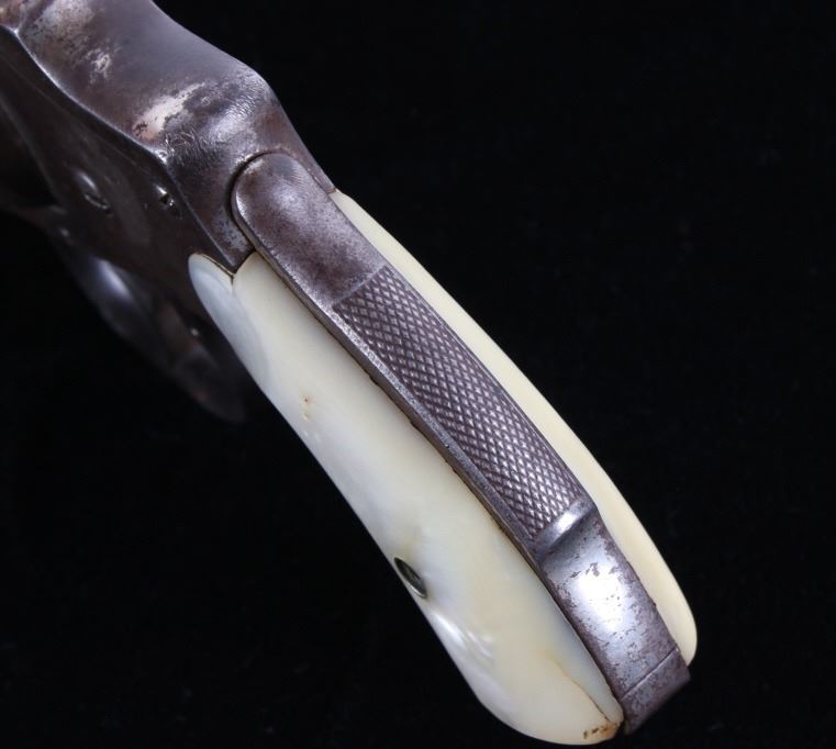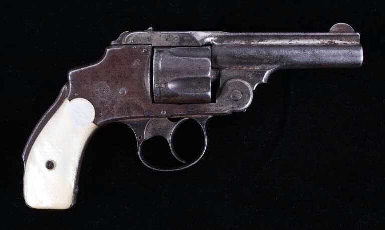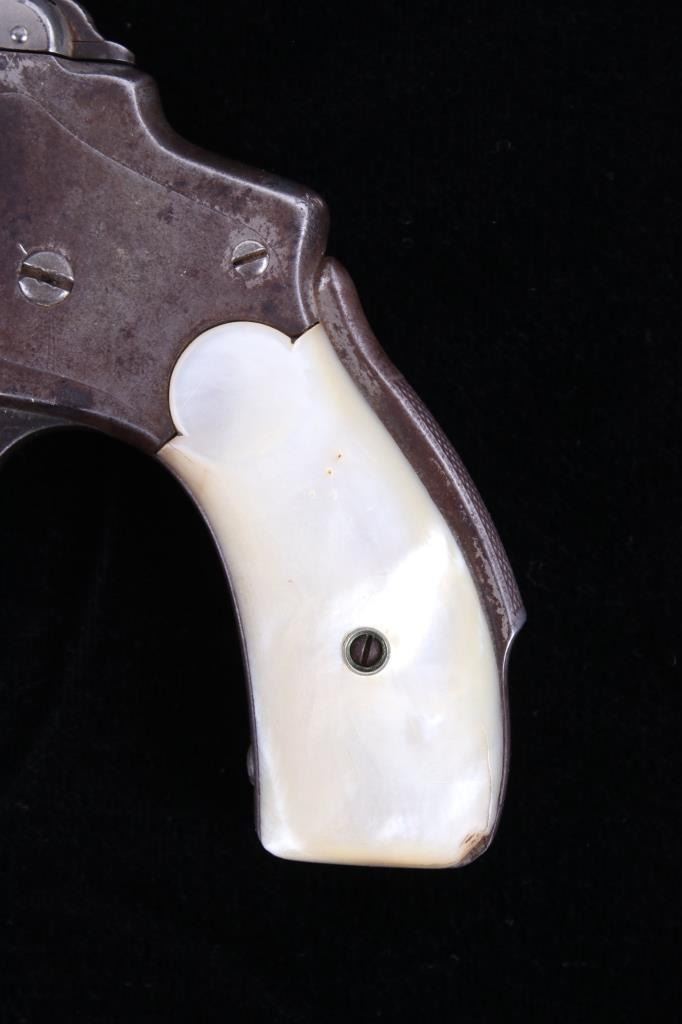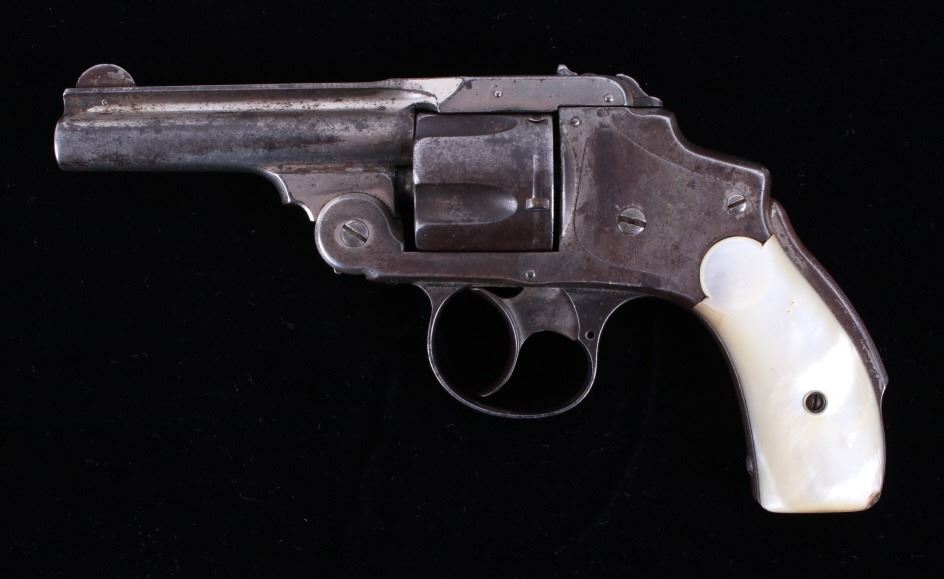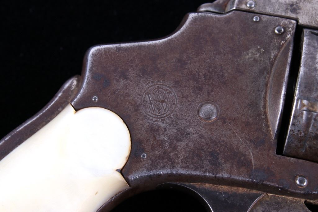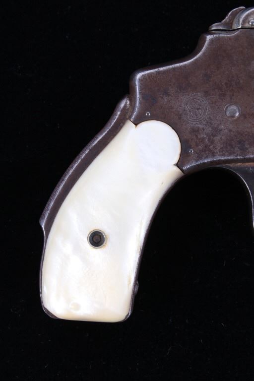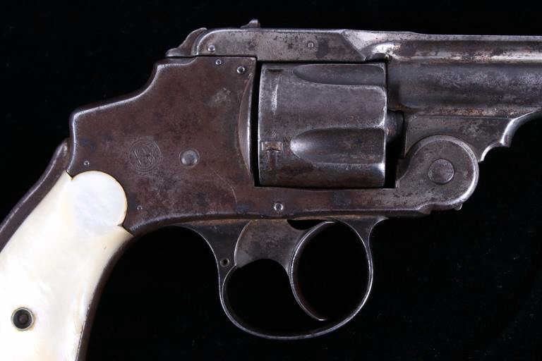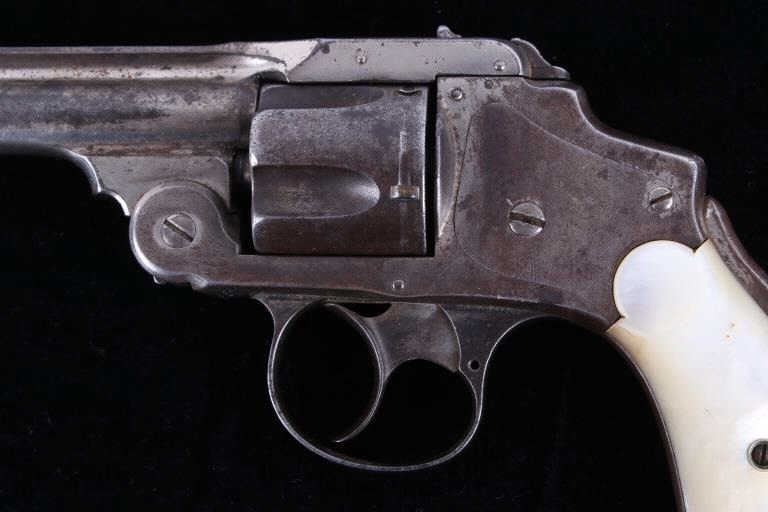 This is a Smith & Wesson Third Model Safety Hammerless "Lemon Squeezer" revolver chambered in .38 S&W caliber.The "Lemon Squeezer" features a 3 ¼” barrel, blue'd finish, pearl grips, and a five shot cylinder. The Smith & Wesson Safety Hammerless or Smith & Wesson New Departure (nicknamed by collectors as the Lemon Squeezer) is a double-action revolver that was produced from 1887 to 1940 by Smith & Wesson. The revolver incorporated an internal hammer and an external grip safety on its backstrap. It was chambered in .32 S&W and .38 S&W calibers; these calibers were discontinued prior to World War II, along with the Safety Hammerless Models. The revolver is marked on the top of the barrel. Overall, the revolver shows good condition, with solid grips, and a plum patina blue finish. The pistol functions, and is in good time, though the mechanics are stiff. Serial Number: 107935. This firearm qualifies as an Antique, and does not require FFL Transfer or NICS Background Check.