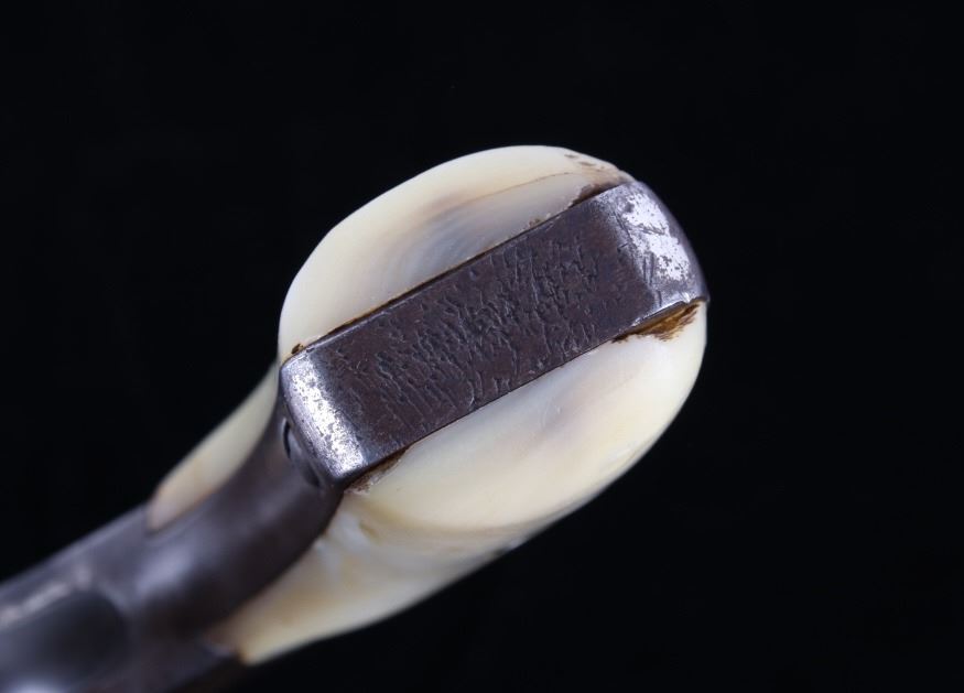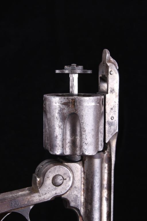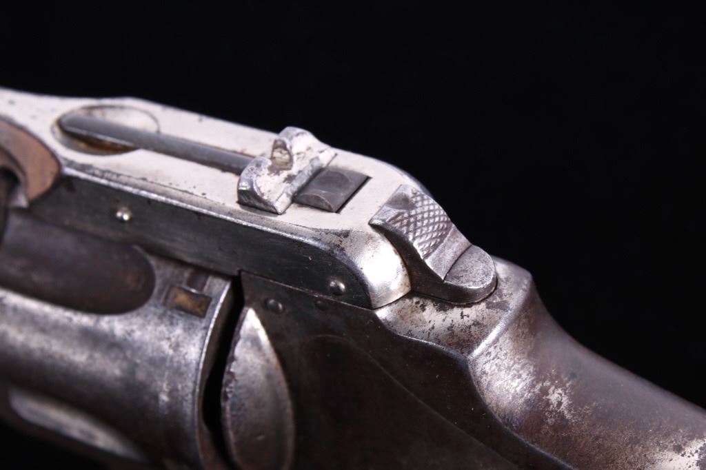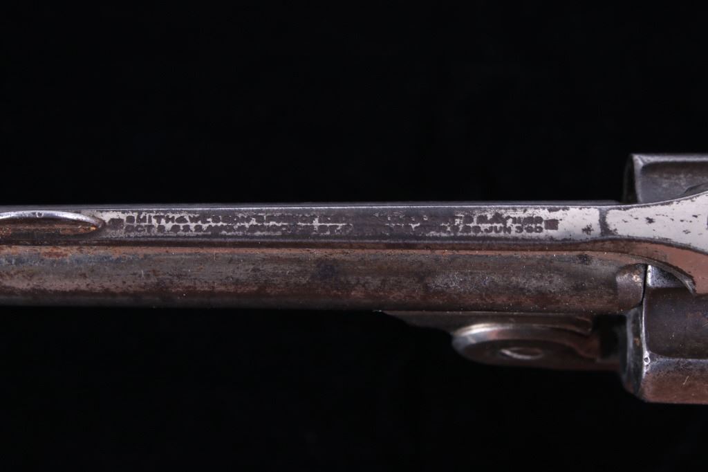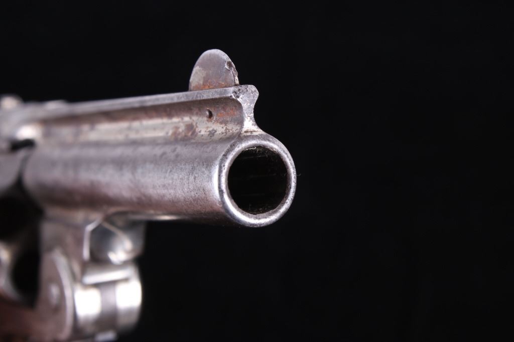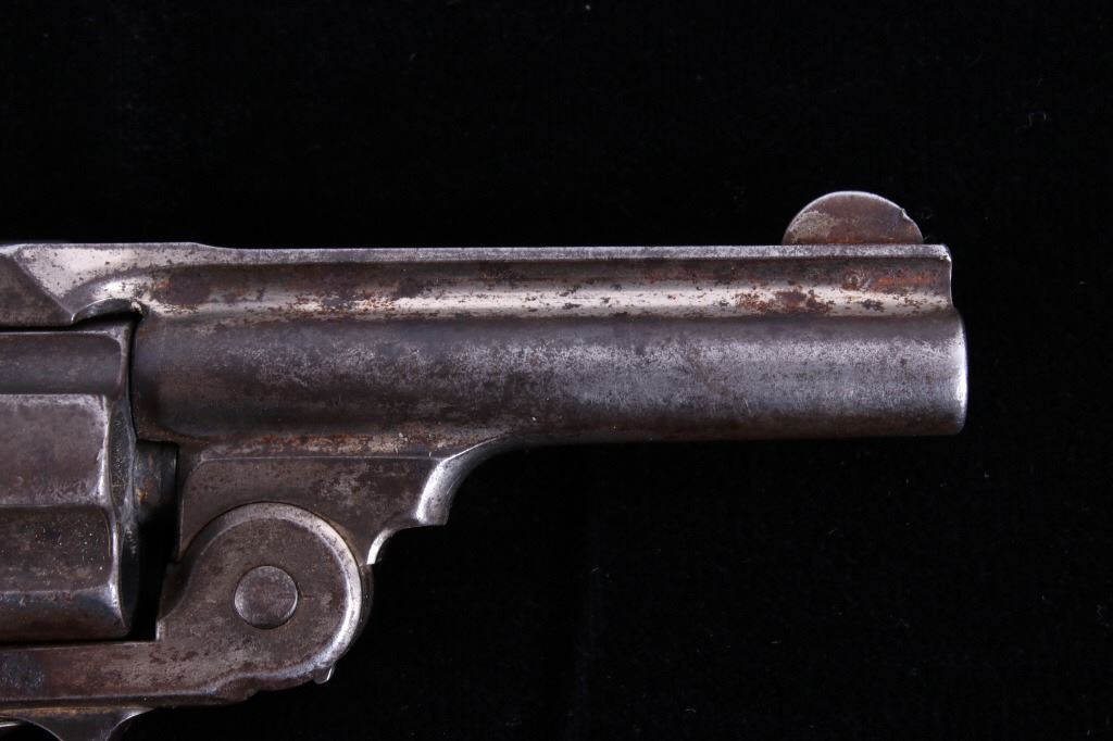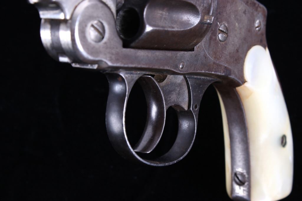This is a Smith & Wesson Third Model Safety Hammerless "Lemon Squeezer" revolver chambered in .38 S&W caliber.The "Lemon Squeezer" features a 3 ¼” barrel, blue'd finish, pearl grips, and a five shot cylinder. The Smith & Wesson Safety Hammerless or Smith & Wesson New Departure (nicknamed by collectors as the Lemon Squeezer) is a double-action revolver that was produced from 1887 to 1940 by Smith & Wesson. The revolver incorporated an internal hammer and an external grip safety on its backstrap. It was chambered in .32 S&W and .38 S&W calibers; these calibers were discontinued prior to World War II, along with the Safety Hammerless Models. The revolver is marked on the top of the barrel. Overall, the revolver shows good condition, with solid grips, and a plum patina blue finish. The pistol functions, and is in good time, though the mechanics are stiff. Serial Number: 107935. This firearm qualifies as an Antique, and does not require FFL Transfer or NICS Background Check.