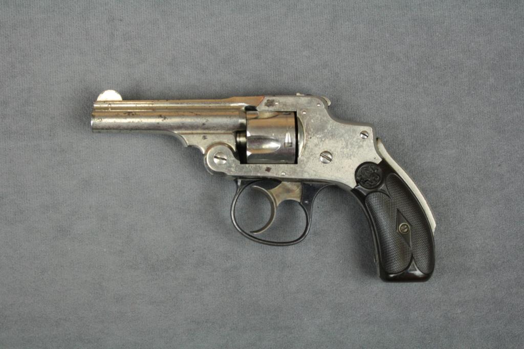 Smith & Wesson Safety Hammerless DA revolver,  .32 cal., 3” barrel, nickel finish,  checkered black hard rubber grips, #35942.  This gun is in overall very good to fine  condition showing approx. 65% originalfrosted nickel finish, very good to fine  bore, crisp action, sharp markings, fine  grips.  Est.:  $150-$250.