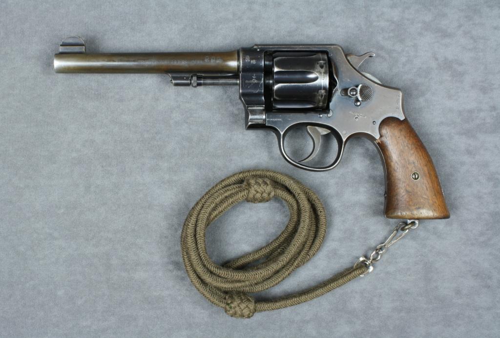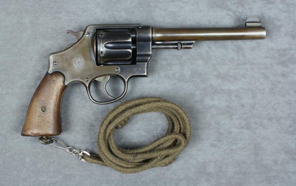 Smith & Wesson Second Model .44 Hand Ejector  DA revolver, .455 cal., 6-1/2” barrel, blue  finish, extensively British proofed, wood  grips, lanyard, #60099. This gun is in  overall very good to fine condition showingapprox. 40% original finish, fine bore,  action and markings; very good grips;  accompanied by a flap leather holster in fine  condition.  Est.:  $400-$800.