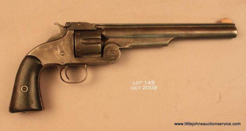 Smith & Wesson Second Model American Single Action revolver, .44 cal., 8” barrel, smooth wood grips, #24977. This gun is in overall fair + condition showing an even dark patina and scattered light to moderate pitting with several traces of nickelfinish remaining on the frame; dark bore, action is working at time of description but the ejector star is inoperable and needs repair; the grips are worn but overall good; front sight is an old copper replacement. Est.: $700-$1,400.