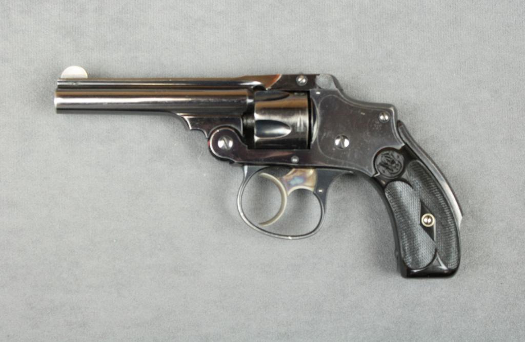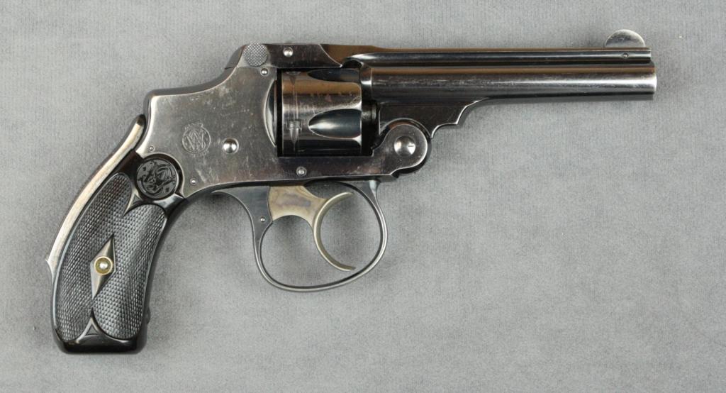 Smith & Wesson Second Model New Departure DA  concealed hammer top break revolver in  original factory box, .32 cal., 3-1/2”  barrel, blue finish, checkered black hard  rubber grips, #97994. This gun is in overallexcellent condition showing approx. 98% +  original finish, fine bore, markings, action  and grips; bright case colors on the trigger;  in original factory box with correct end  label and interior instructions on inside oflid; box is overall excellent with just  slight wear.  Est.:  $500-$1,000.