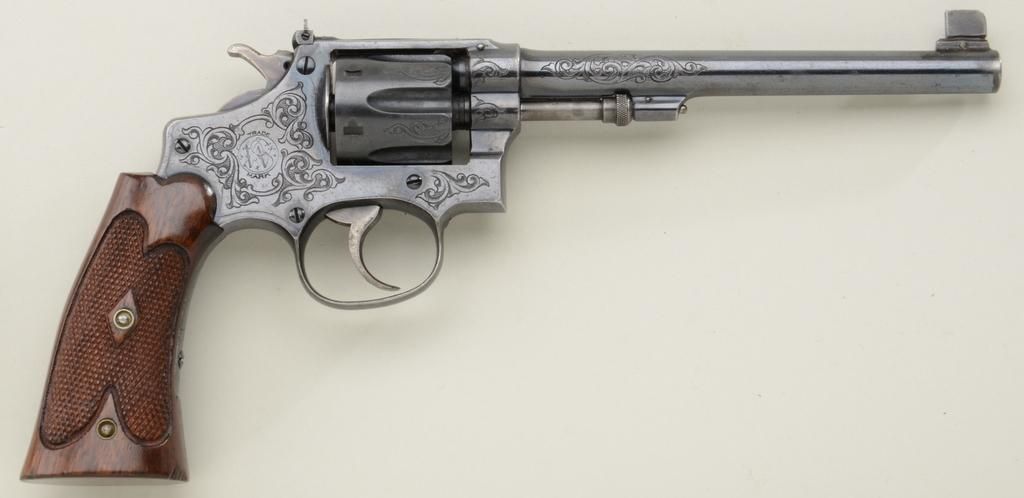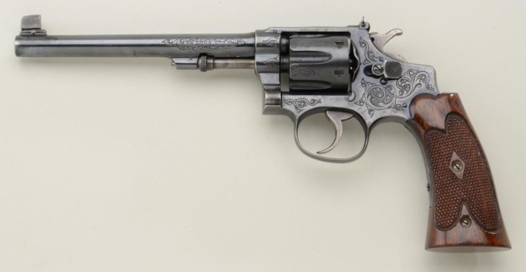 Smith & Wesson Second Model Target revolver, .32 long cal., 6” barrel, target sights, blue finish, engraved, checkered extended target wood grips, #209734. This gun is in overall very good to fine condition showing themajority of its original blue finish, factory style engraving but no letter available at time of description; very good bore, crisp action, sharp markings, very good varnished wood grips. From the Dr. John HallCollection. Est.: $750-$1,500.