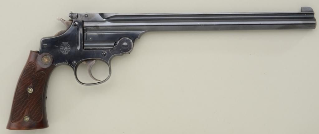 Smith & Wesson Third Model Perfected Target Pistol, .22LR cal., 10” barrel, blue finish, checkered extended medallion wood grips, #8197 (all matching visible numbers). This gun is in overall fine to excellent condition showing approx. 96% original finish, fine bore, action and markings, beautiful fine target grips; less than 7,000 of these fine target pistols were made by S&W. From the Dr. John Hall Collection. Est.: $600-$1,200.