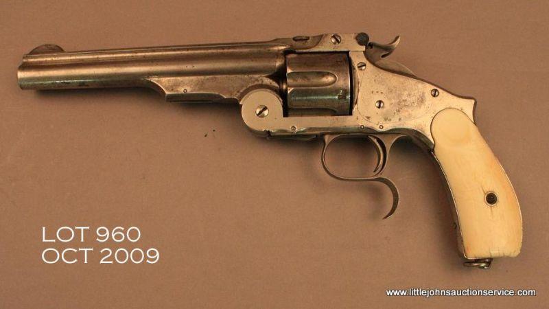 Smith & Wesson Third Model Russian Single Action revolver, .44 cal., 6-1/2” barrel, nickel finish, ivory grips, #1199. This gun is in overall very good condition showing approx. 35% original finish with the balance going to a pleasing light metalpatina; all matching visible serial numbers, very good bore, crisp action and markings, finger rest trigger guard, beautiful mellow ivory grips with lanyard ring in butt and “1974”dated butt strap. A really nice big frame Single Action S & W. Es $2,500-$5,000.