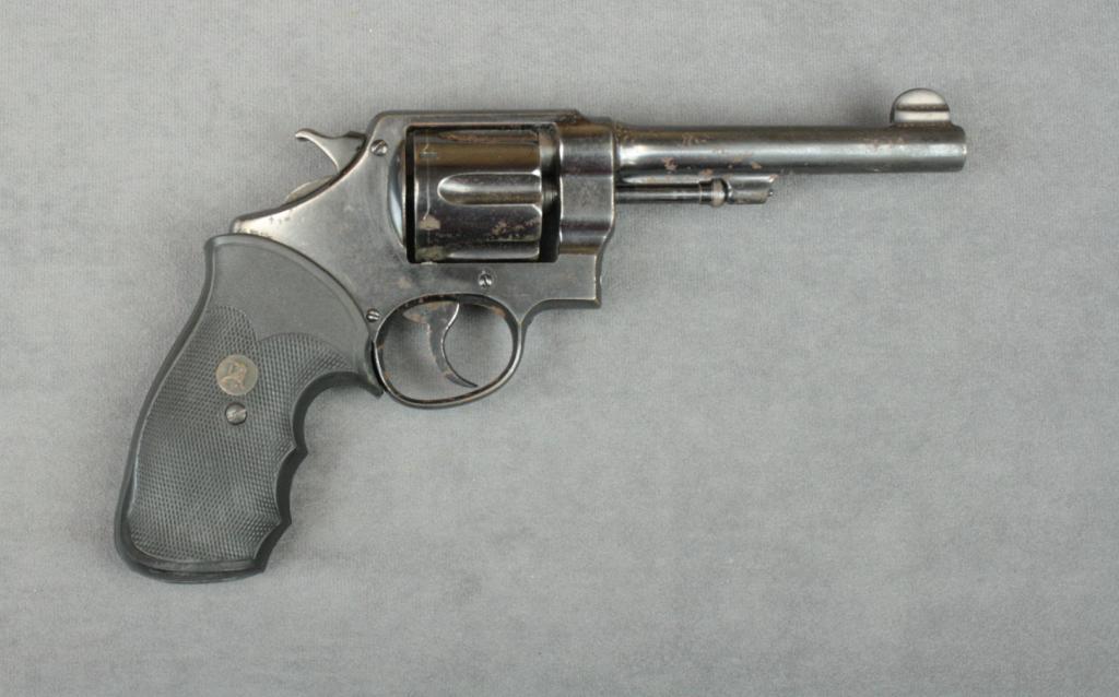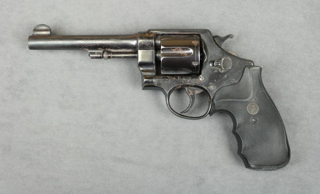 Smith & Wesson U.S. Army Model 1917 DA  revolver, .45 cal., 5-1/2” barrel, re-blued  finish, Pachmayr finger groove checkered  combat rubber grips, #42943. This gun is in  overall fair to good condition as refinished; majority of re-blue remains with scattered  areas of surface rust and spots of erosion  that would be greatly helped by a careful  cleaning and oiling; the action is very good,  the bore should clean to very good, goodgrips.  Est.:  $200-$300.