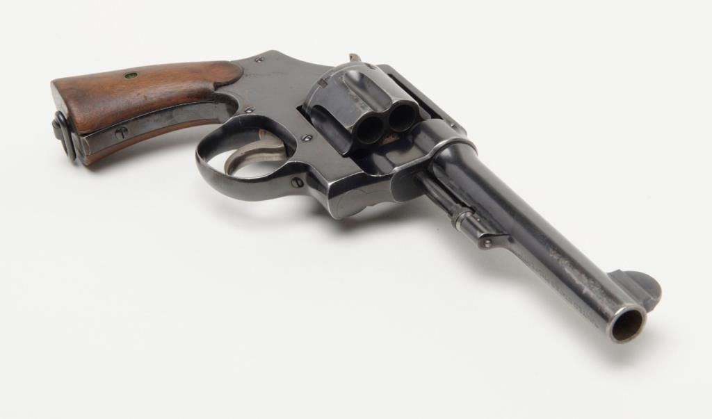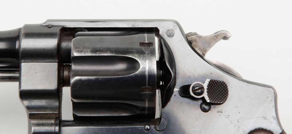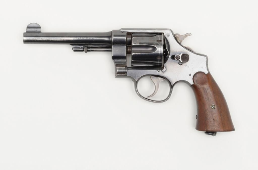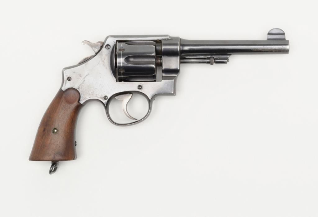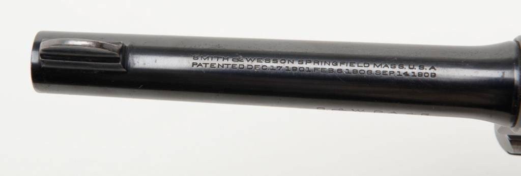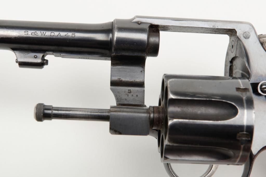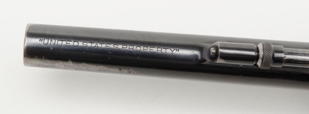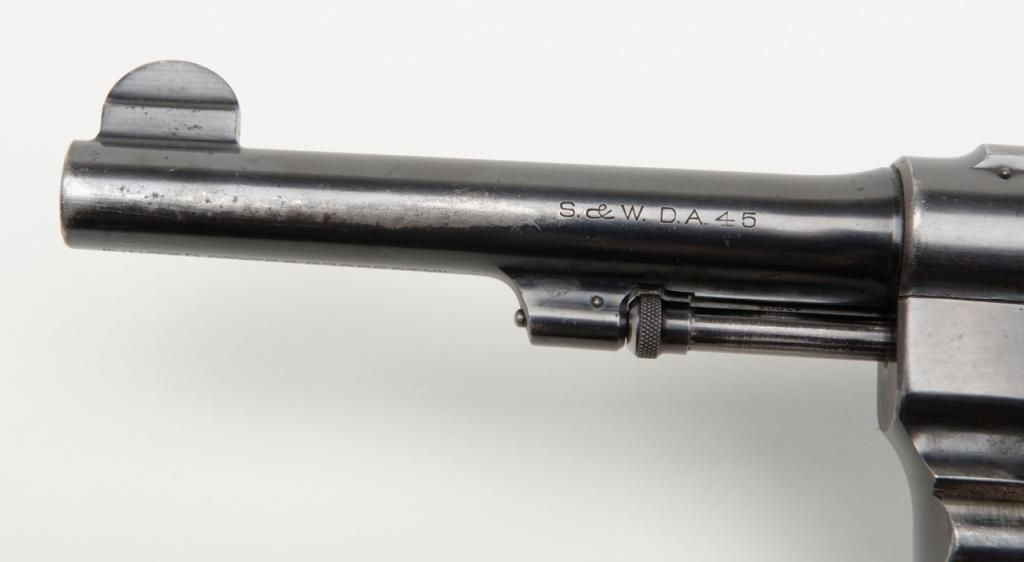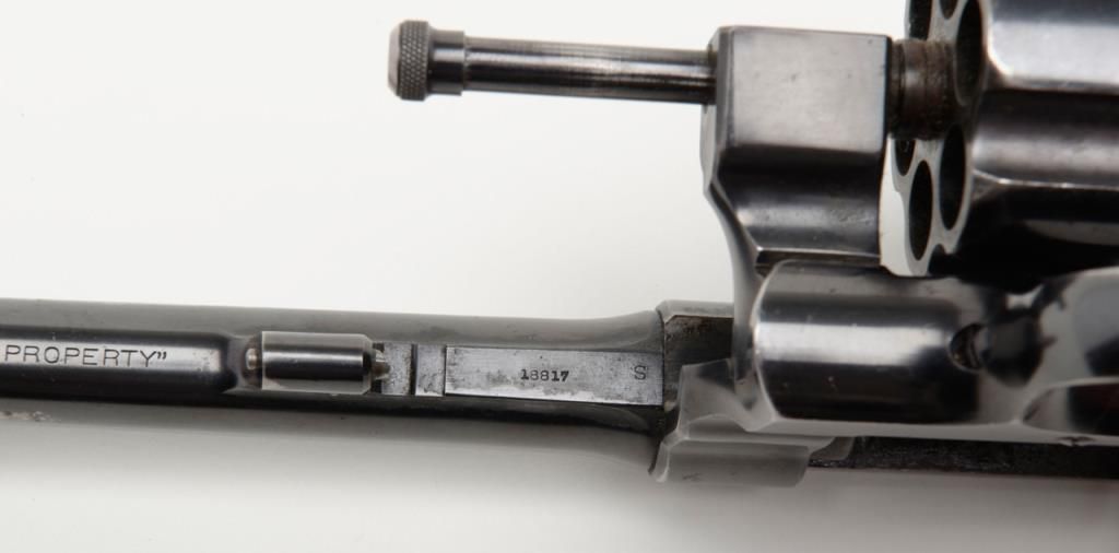Smith & Wesson United States Property marked Model 1917 DA revolver, .45 cal., 5-1/2” barrel, blue finish, wood grips, lanyard ring, #18817 in overall very good condition showing considerable original finish, markings on butt strap have beenremoved some time ago but barrel and cylinder numbers match, bore is gone, action and remaining markings are crisp, grips are good with some scattered mars and scratches; hammer and trigger show considerable original case colors; from anold California bay area estate. (C&R). Est.: $300-$600.