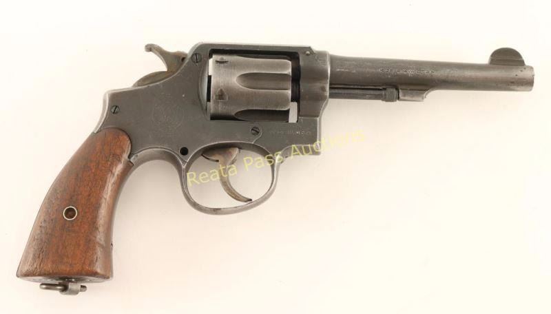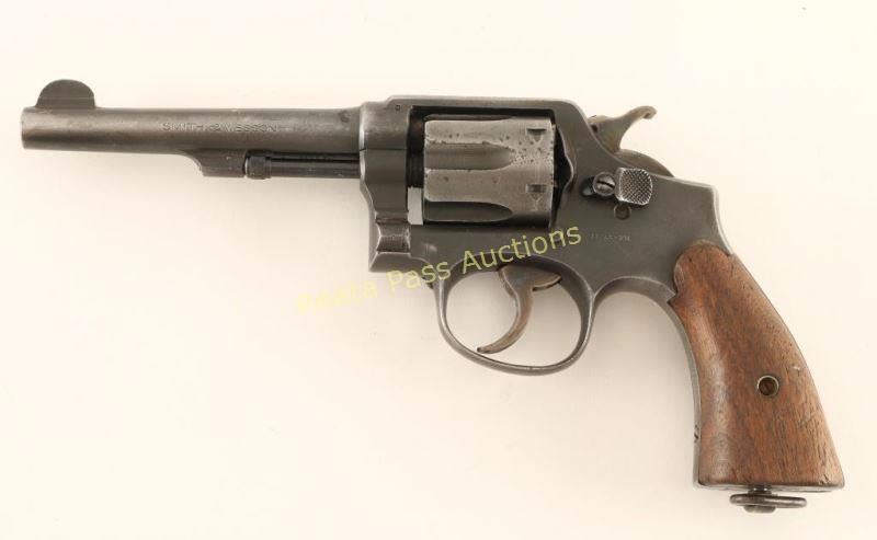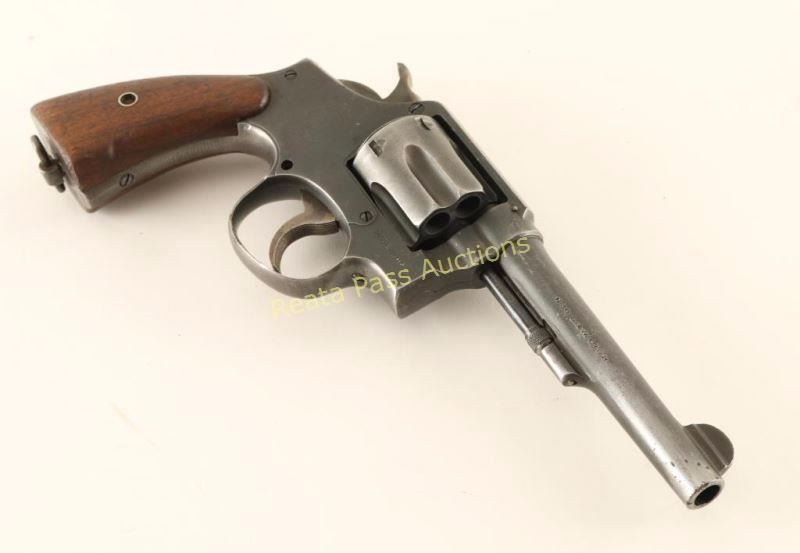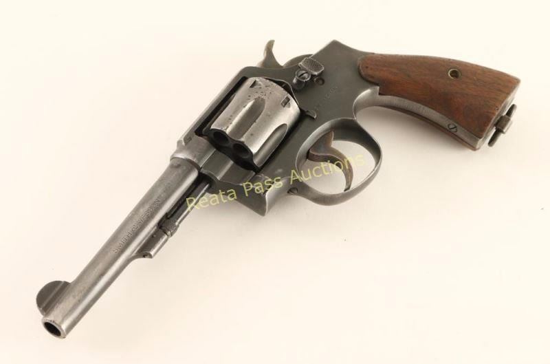 U.S. Property marked medium frame double-action revolver chambered in .38 Special, circa 1940's. Features a sandblast blued finish, 5" pinned barrel with forged round blade front sight, square notched rear sight, non-shrouded ejector rod, fluted six-shot cylinder, serrated case hardened trigger, case hardened hammer with checkered spur, lanyard ring, and smooth two-piece walnut grips. Markings: Frame - "(ordnance bomb) U.S. PROPERT G.H.D." & "CAL. .38 SPECIAL". Matching serial numbers on the butt, barrel, cylinder, extractor and right grip panel. Revolver exhibits approximately 65% of what appears to be a well accomplished refinish showing honest wear with a few freckles of surface rust observed on the barrel around the front sight and the cylinder around one of the flutes. Action is smooth with very good lock-up, bore is excellent, and wood grips are good to very good with several small blemishes. Condition is good+++. ***C&R Firearm*** ***Modern Firearm***