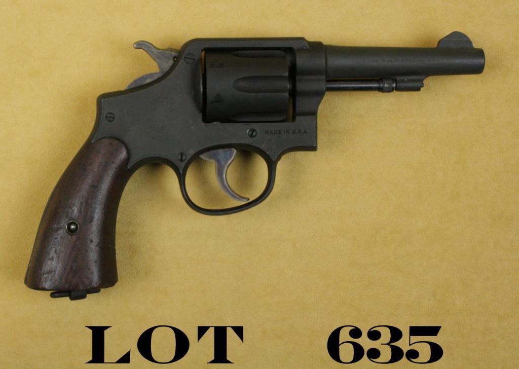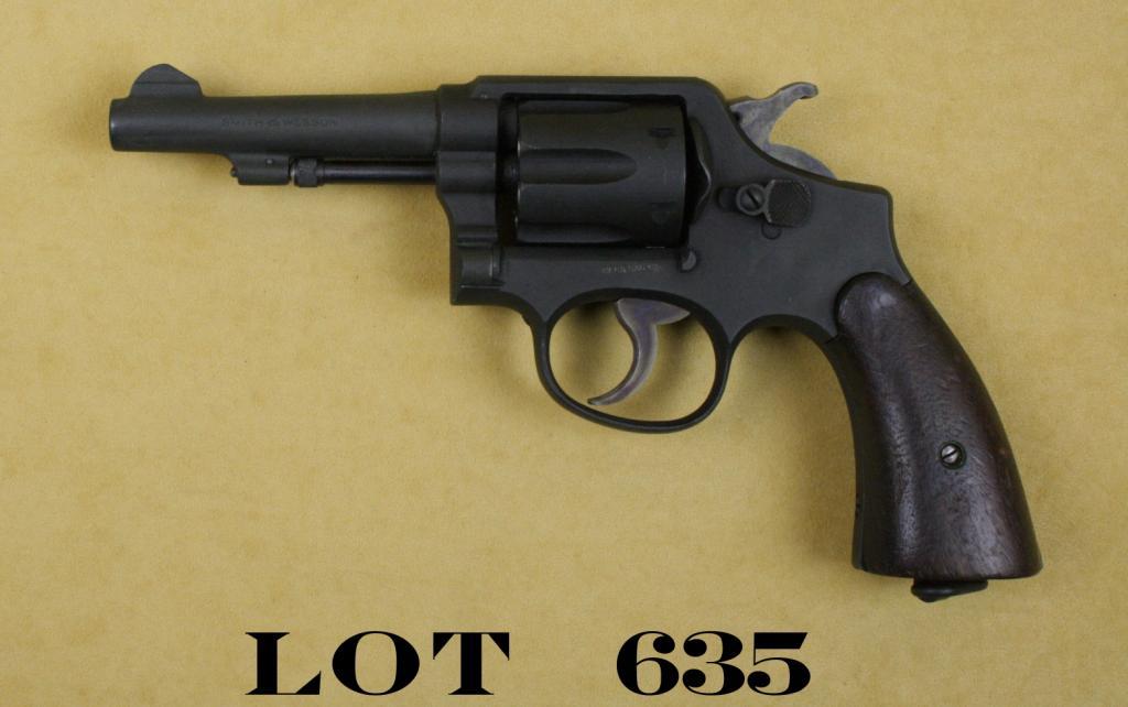 Smith & Wesson Victory Model DA revolver, U.S. Property marked and inspected, .38 Special cal., 4” barrel, parkerized finish, import marked, smooth wood grips, #V501813. This gun is in overall very good conditionshowing the majority of its military parkerized finish on metal surfaces, good action, overall good bore with some slight erosion near the muzzle, broad arrow proofed on right side of frame, case colors on hammer and trigger, lanyard ring retained, overall good grips with scattered mars and dings from storage; desirable collector variation and 5-screw construction; likely a lend/lease weapon. Est.: $150-$300.