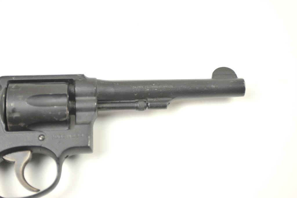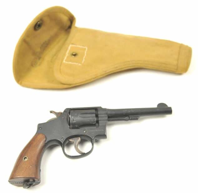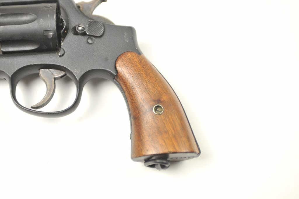 Smith & Wesson Victory Model, #V366164, .38/200 cal., matte gray finish, fixed sights, with smooth wood grips. Revolver is in very good condition as refinished, good bore, good action, grips are very good butslightly undersized. British proofs on the left side of the barrel post refinish. Lanyard loop retained. Includes a tan British canvas flap holster dated 1948. (C&R/PPT) Est. $300-600