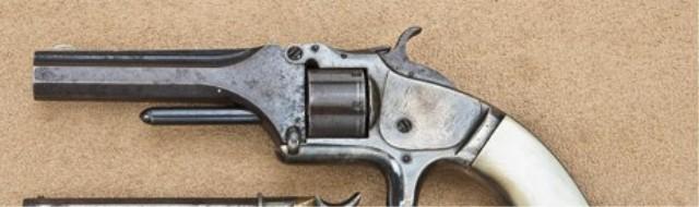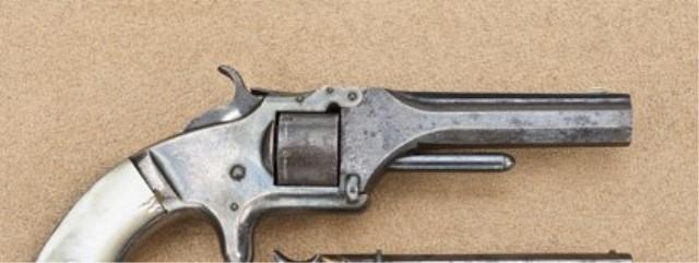Smith & Wesson first model 2nd issue .22 caliber revolver, blue and silver finish, original pearl grips, serial #68129. The barrel and cylinder show 30-50% original blue drifting to brown, the frame shows 90% darkened silver, the grips are good with some crazing and small losses. The barrel and cylinder show some light erosion and pinprick pitting. The markings are good, the edges are sharp, the bore is slightly rough. From the Bernard Braverman Estate. Est: $300 - $600