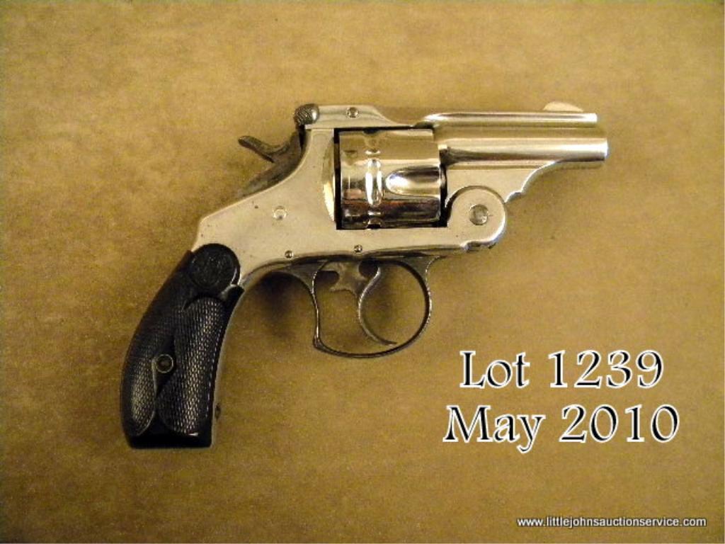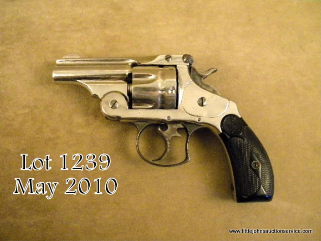 Smith & Wesson first model DA frontier revolver, 44-40 cal., nickel finish, hard rubber grips, barrel reduced to 2-1/2”, #2279. The pistol shows 95% of an older re-nickel finish, the grips are good, the action and bore are good. A favoritemodel of John Westley Hardin who carried two in custom holsters made inside his vest. Great for re-enactors. The barrel has been neatly shortened and the front sight neatly replaced. Est.: $400-$800.
