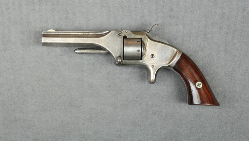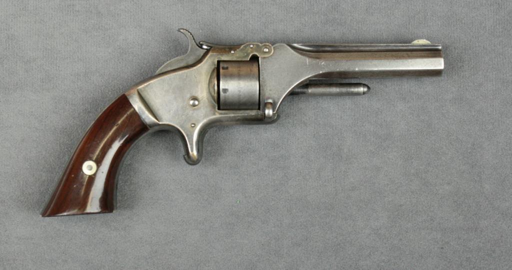 Smith & Wesson first model second issue, .22 caliber revolver, blue and silver finish, varnish wood grips, serial #67332. The revolver remains in good condition showing traces of original blue drifting to greypatina with some light erosion and pinprick pitting. The frame shows 90% silver, the marking on the barrel and cylinder are good. The grips retain 90% varnish. The action is good but not holding on full cock. From theBernard Braverman Estate. Est: $200 - $400