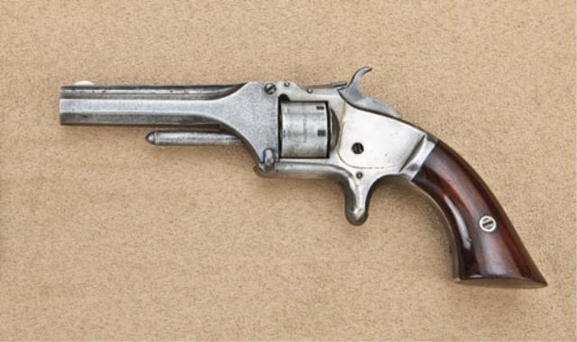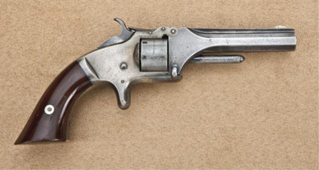 Smith & Wesson first model second issue, .22 caliber revolver, blue and silver finish, varnish wood grips, serial #67332. The revolver remains in good condition showing traces of original blue drifting to grey patina with some light erosion and pinprick pitting. The frame shows 90% silver, the marking on the barrel and cylinder are good. The grips retain 90% varnish. The action is good but not holding on full cock. From the Bernard Braverman Estate. Est: $200 - $400