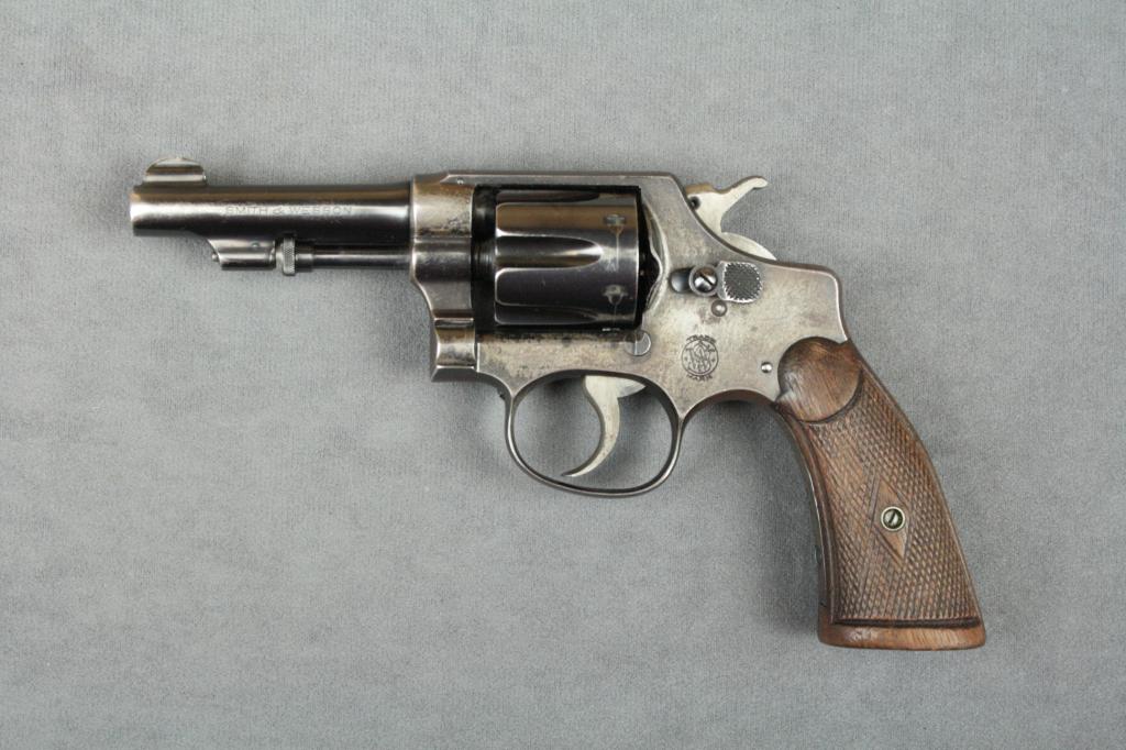 Smith & Wesson five screw hand ejector revolver, .32 long cal., 3-1/4” barrel, blue finish checkered wood grips, #319423. This gun is in overall very good condition showing approx. 40% original blue finish, good bore, action and markings; wood grips are overall good showing wear from carry and Patent dated on bottom of left grip “Pat. June 5, 1917”. Est.: $150-$300.