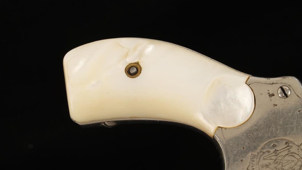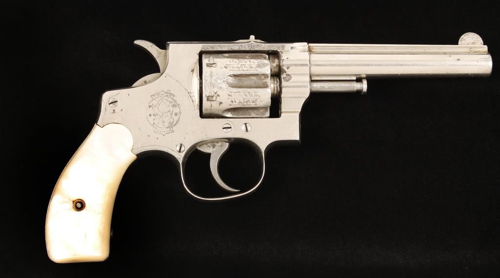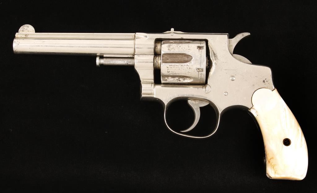 1st Model. Nickel plated double-action 6-shot revolver with a 4-1/4" barrel. Finish is scratched and dinged with missing flakes and areas of rust perforations in the plating. Roll-stamping on the cylinder is legible but it has many dings. Color case hardening has faded from the hammer and the trigger. Mother-of-pearl grips have a large flake and 2 small chips missing. Function is good. Bore is shiny with rifling and some pitting. Chambers are good. Condition is fair.