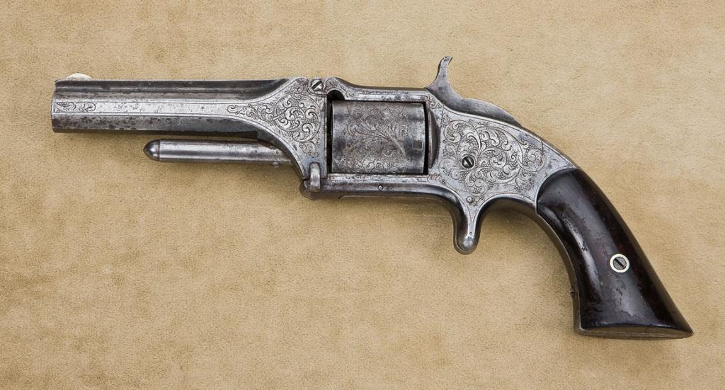 Smith & Wesson model 1-1/2 Old model, New York style scroll engraved through the original blue finish, varnish wood grips, .32 rimfire, serial number “20215”. The revolver remains in original good to very good condition with 20-40% original blue evenly drifting and toning to a light grey patina. Some minor surface erosion, pinprick pitting, mostly on the top of the barrel and back of the cylinder. The barrel address is good, the hammer shows 50% case hardening. The varnish wood grips are good to very good with 50-60% original varnish. The action is tight, the bore is fair to good. Occasionally New York engravers would cut through the original blue and not finish the revolver which is the case in this example. Est: $700 - $1,400