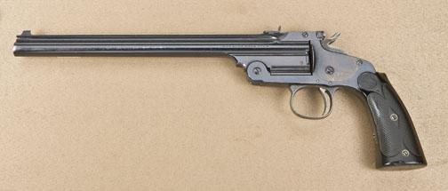 Smith & Wesson model 1891 Target, single-shot pistol, factory 10” barrel, blue finish, hard-rubber grips, serial #11189. The pistol shows approx. 75-85% original bright blue drifting on the edges and side plate, tracesof case hardening on trigger guard, 60% case hardening on hammer. The grips are slightly worn and there is a large chip from the grip where it meets the backstrap. The barrel has been mounted with a period v-notch sightright at the breech. The action is tight, the bore is bright. Est: $750 - $1,500