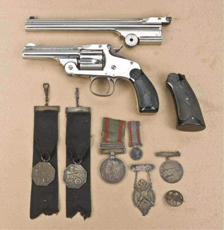Smith & Wesson model 1891 single-action .38 S&W caliber 5-shot revolver, factory 3-1/4” barrel, nickel finish, hard-rubber grips, serial #8088. Along with extra .22 caliber single-shot 8” barrel, also nickel platedwith extension target grips. Factory letter states “Shipped August 22nd 1893 to H. P. Devier & Co. Address unknown. Verifies 3-1/2” barrel, extra .22 single-shot target barrel, 8”, nickel finish, standard stocks, andextra pair of black hard-rubber extension stocks. Lot includes a collection of medals belonging to H. Scholefield, by collector’s tradition, the owner of this pistol. One medal shows Victoria, the province ofSaskatchewan, which is stamped “TPr Harold Schofield. Gov Gen Bodyguard”. Along with Schutzen medal engraved November 31 1881, with Harold Scholefield”. Two American Trap Shooter Association Medals, also inscribed.10/10/83 medal inscribed Won By H. Scholefield. A silver pin that is pierced with “OGRC” initials. And a small military-style medal showing Victoria with ribbon. Apparently Scholefield’s name was