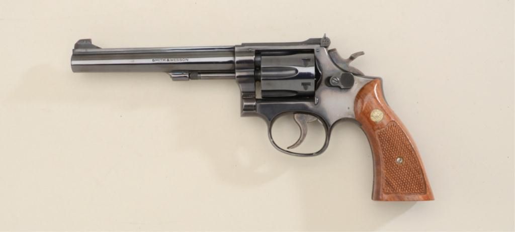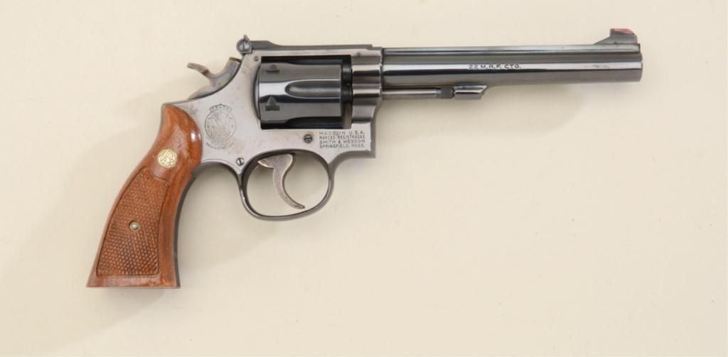 Smith & Wesson model 48-4, #19K5615, .22 Mag. cal., 6" pinned barrel, adjustable sights, blued finish with checkered medallion grips. Near fine condition, 90-95% original finish showing some losses on the right side accesspanel. Front sight has been highlighted in nail polish for visibility, faint cylinder drag line, but fired very little. Action is very good, bore is excellent. Est. $400-800.