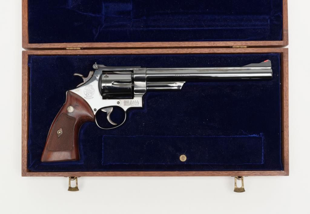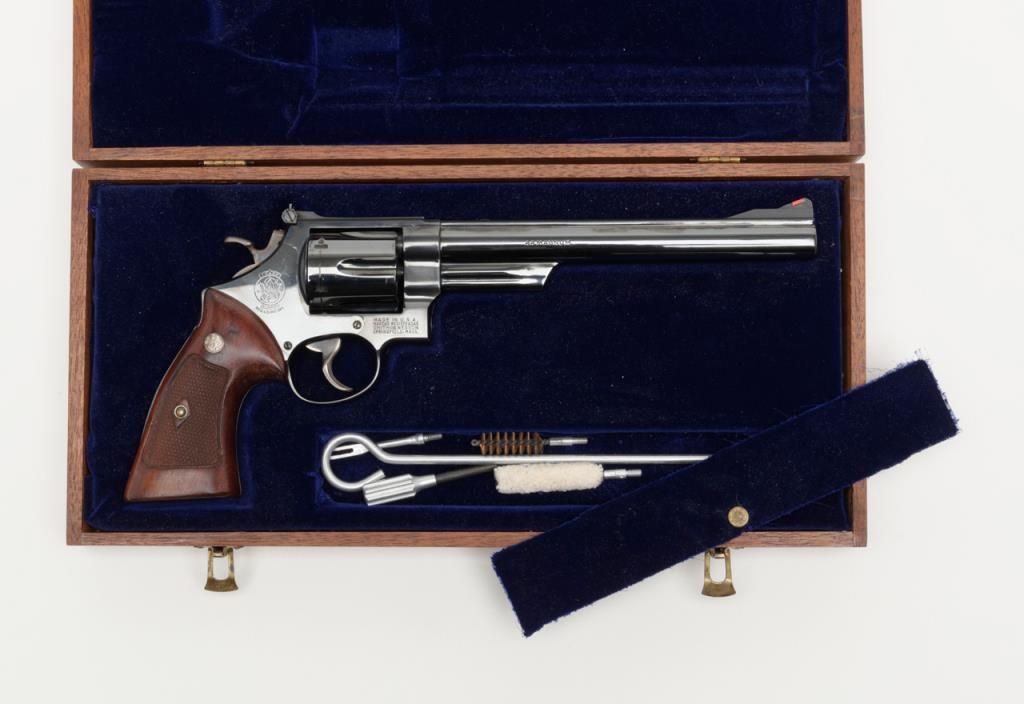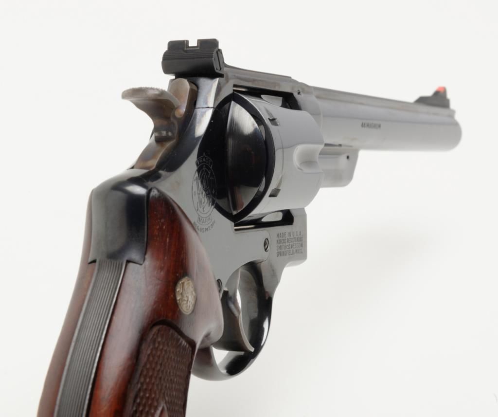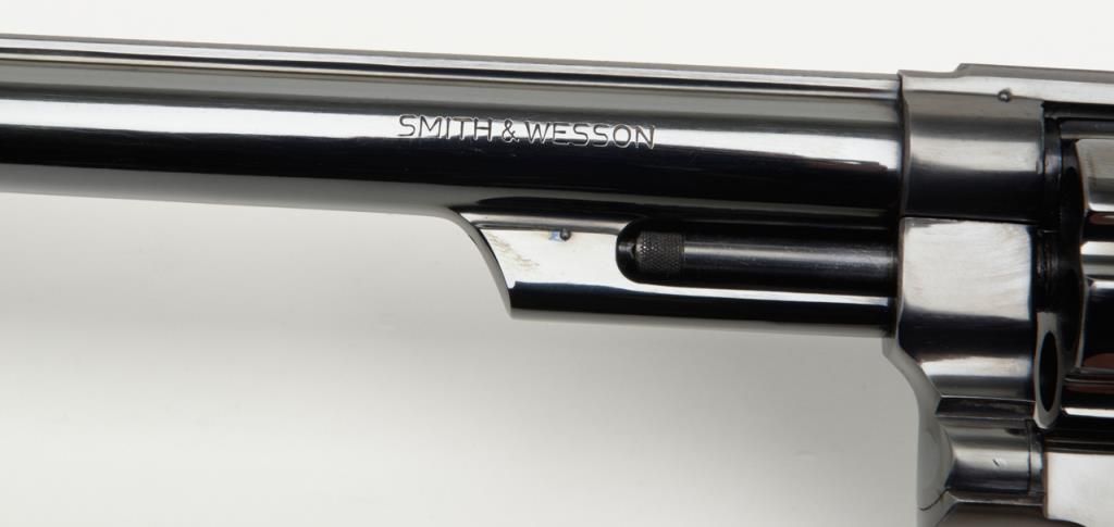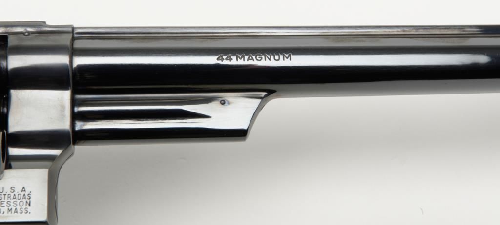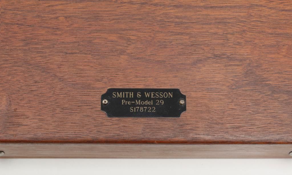 Smith & Wesson pre-Model 29 DA revolver, 4 screw .44 Magnum cal., 8-3/8” pinned barrel, high polish blue finish, checkered wood medallion combat grips, target hammer, target trigger, #S178722 (circa 1958); in overall fine to excellentcondition showing approx. 98%+ original bright blue finish, fine bore, action, markings and grips; contained in factory lined wood presentation casing with later factory cleaning kit and screwdriver; a beautiful early pre-29 with the big barrel. (C&R/PPT). Est.: $1,400-$2,800.