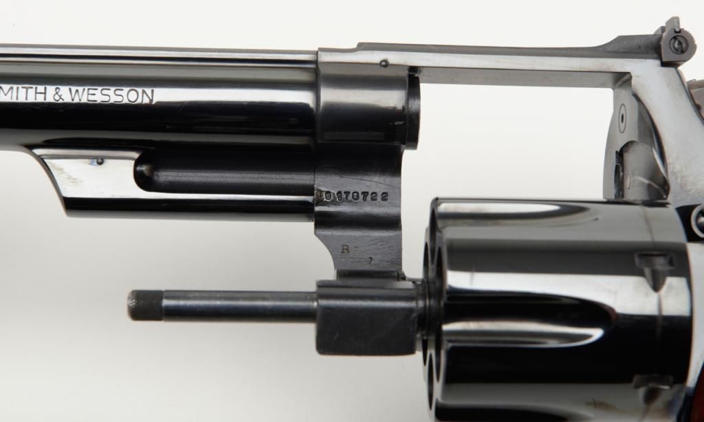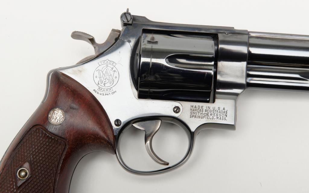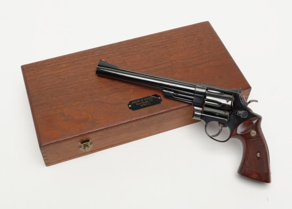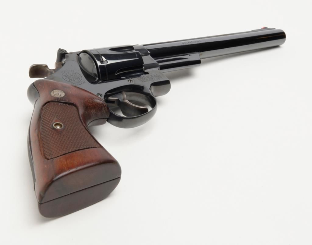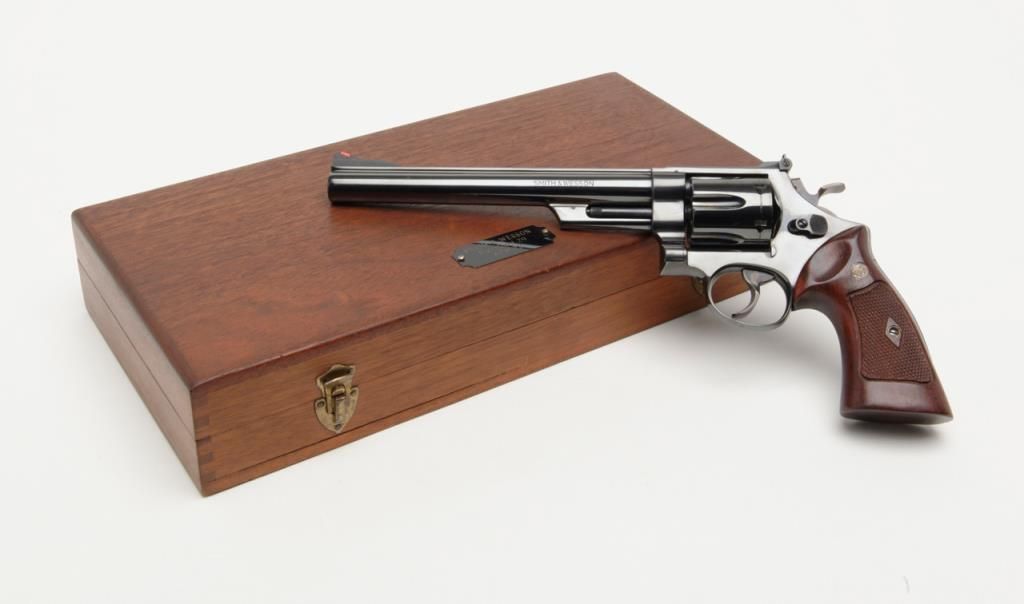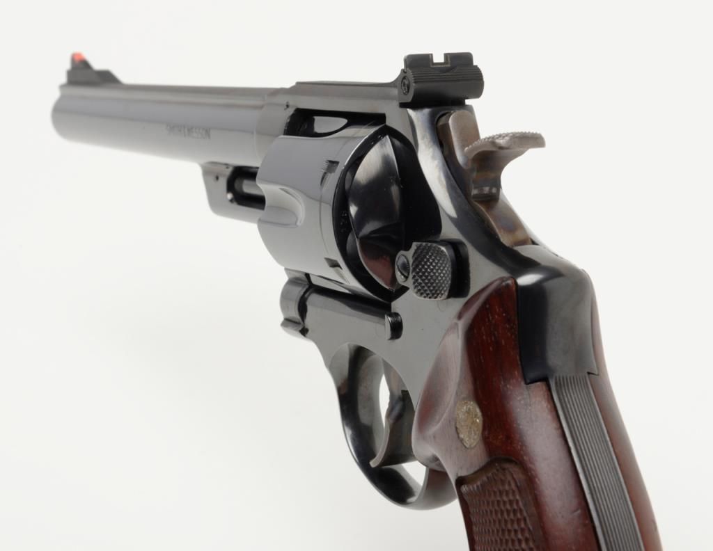 Smith & Wesson pre-Model 29 DA revolver, 4 screw .44 Magnum cal., 8-3/8” pinned barrel, high polish blue finish, checkered wood medallion combat grips, target hammer, target trigger, #S178722 (circa 1958); in overall fine to excellentcondition showing approx. 98%+ original bright blue finish, fine bore, action, markings and grips; contained in factory lined wood presentation casing with later factory cleaning kit and screwdriver; a beautiful early pre-29 with the big barrel. (C&R/PPT). Est.: $1,400-$2,800.