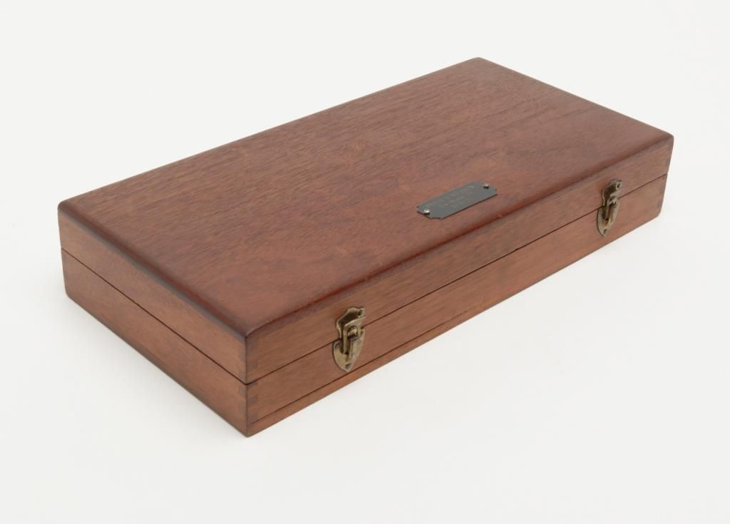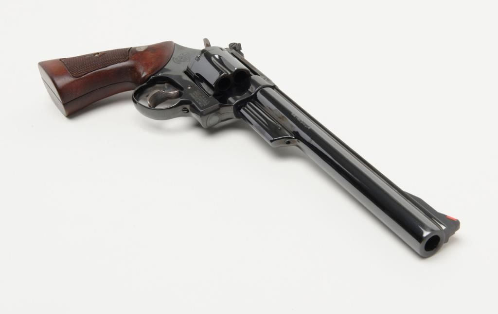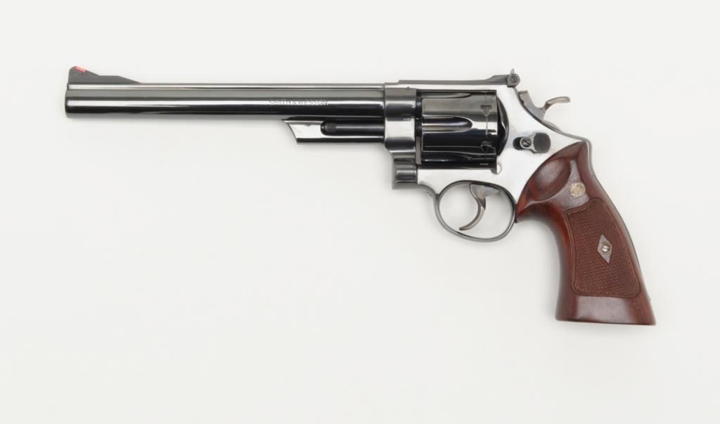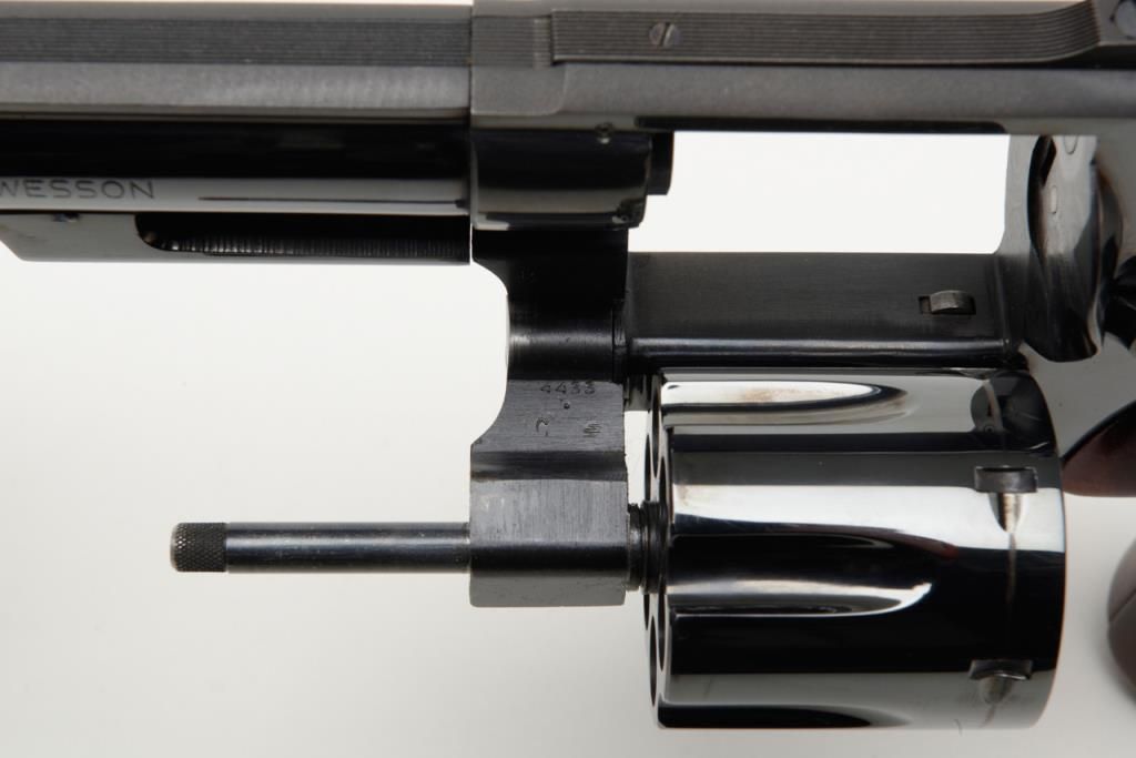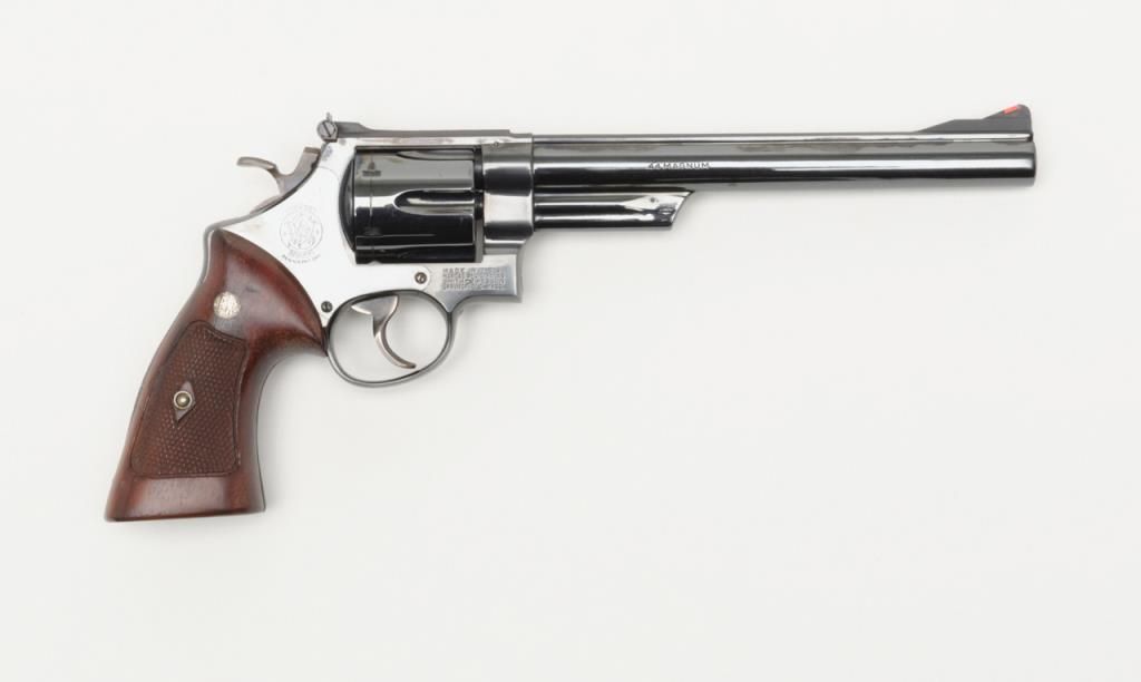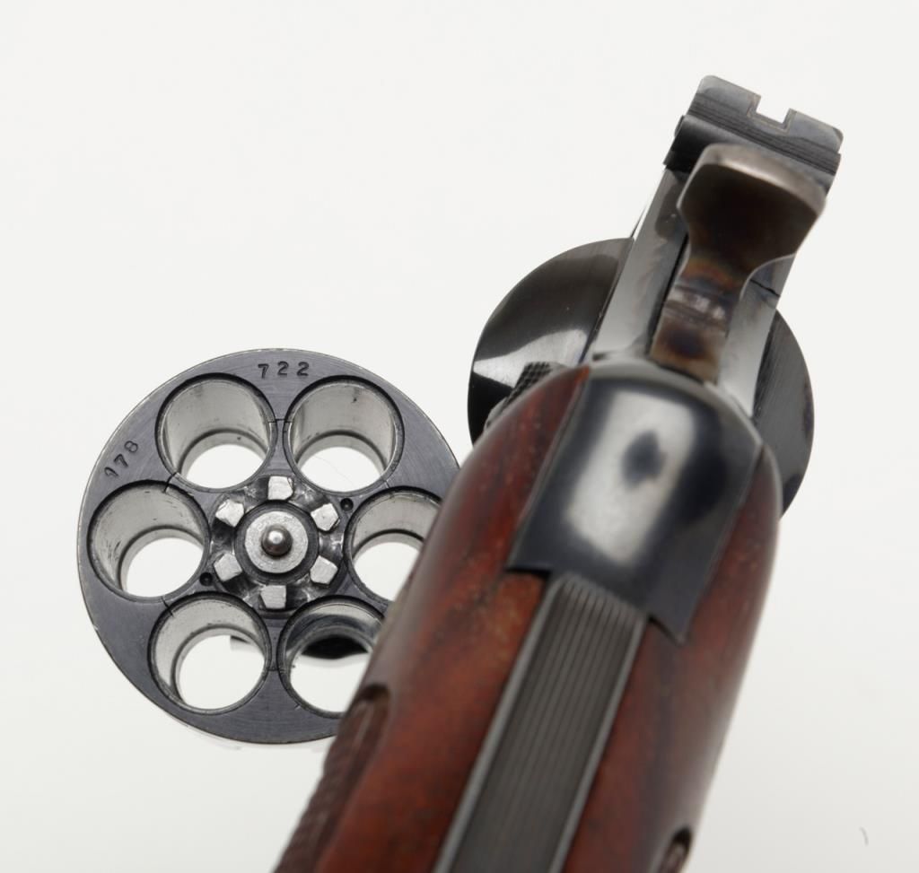 Smith & Wesson pre-Model 29 DA revolver, 4 screw .44 Magnum cal., 8-3/8” pinned barrel, high polish blue finish, checkered wood medallion combat grips, target hammer, target trigger, #S178722 (circa 1958); in overall fine to excellentcondition showing approx. 98%+ original bright blue finish, fine bore, action, markings and grips; contained in factory lined wood presentation casing with later factory cleaning kit and screwdriver; a beautiful early pre-29 with the big barrel. (C&R/PPT). Est.: $1,400-$2,800.
