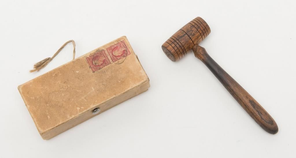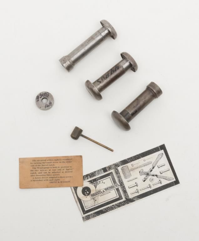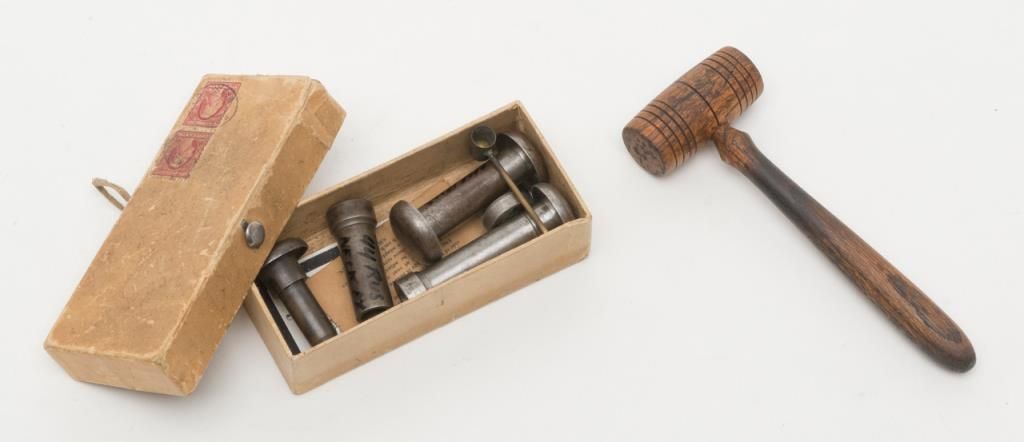 Smith & Wesson reloading set for .44 Russian consisting of two bullet sizing dies, greaser, powder dipper, mallet and cartridge case holder in old cardboard box that it was shipped in showing two 2 cent stamps canceled at SpringfieldMassachusetts. Est.: $150-$300