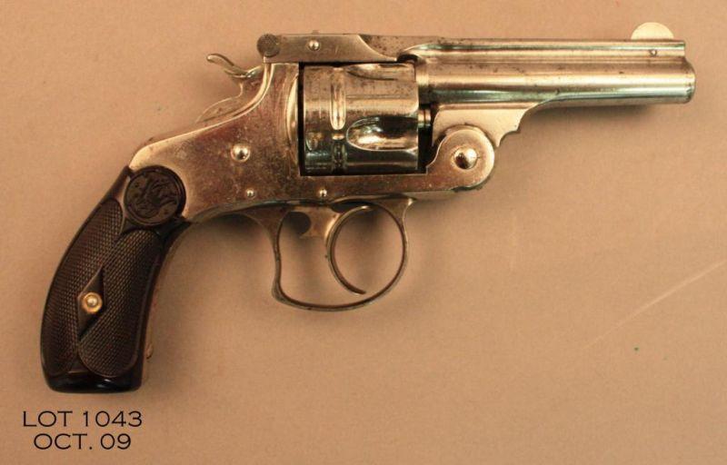 Smith & Wesson second model top break DA revolver, .38 cal., 3-1/4” barrel, nickel finish, checkered black hard rubber grips, #5225. This gun is in overall very good condition showing approx. 50% original finish with the balance of the metalsurfaces polished to an even patina matching the remaining nickel; the action is good, as are the markings, grips and the bore is fair +. Est.: $150-$300.