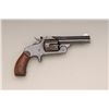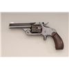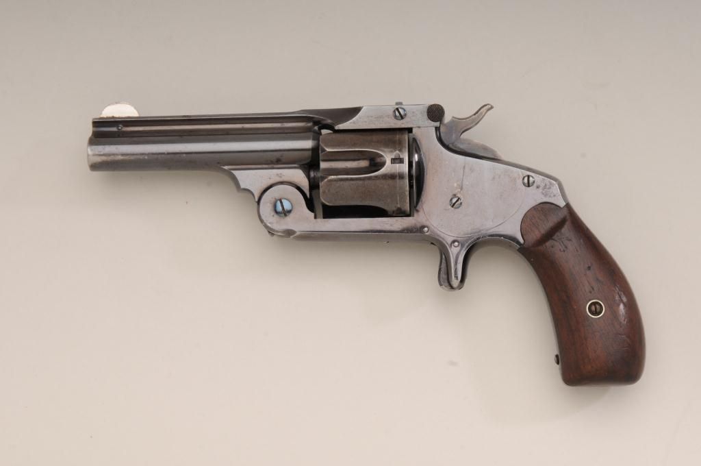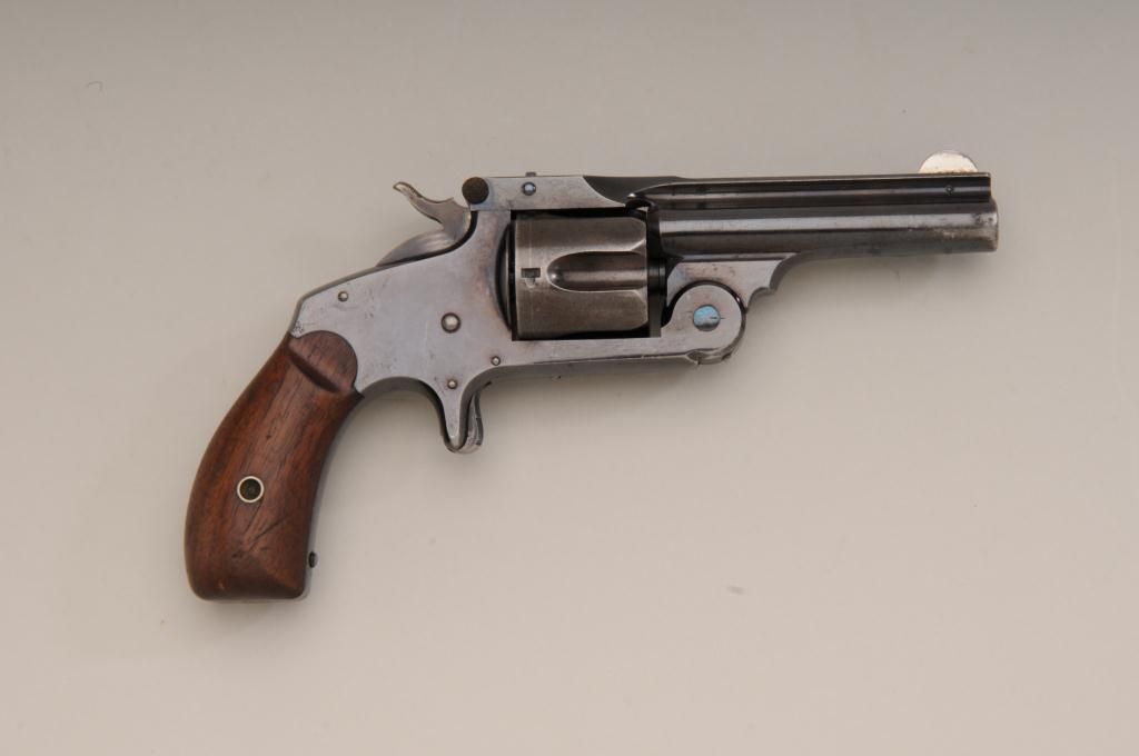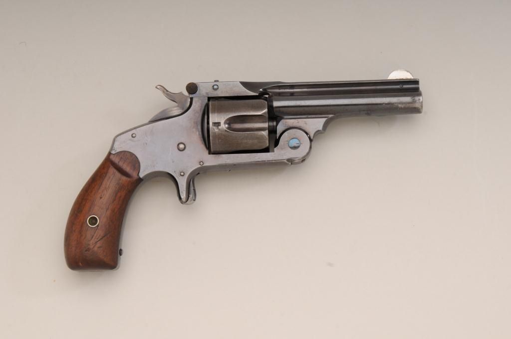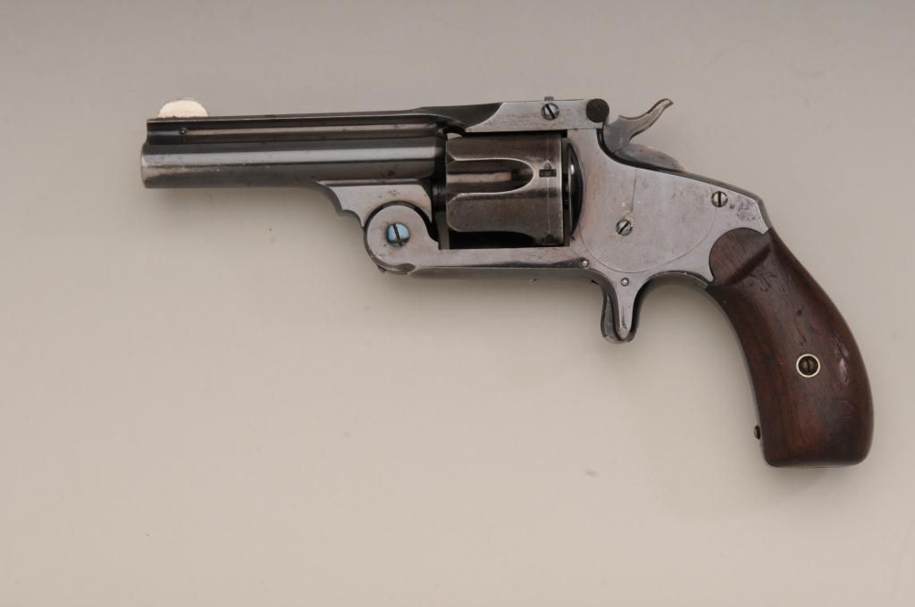 Smith & Wesson spur trigger top break 2nd Model revolver, .38 cal., 3-1/4” barrel, blue finish, wood grips, #19013. This gun is in overall fine condition showing approx. 75% original finish with crisp action, sharpmarkings and fine bore; wood grips are very good to fine condition with several scattered old small mars from carry and storage; nickeled front sight. Est.: $400-$800.