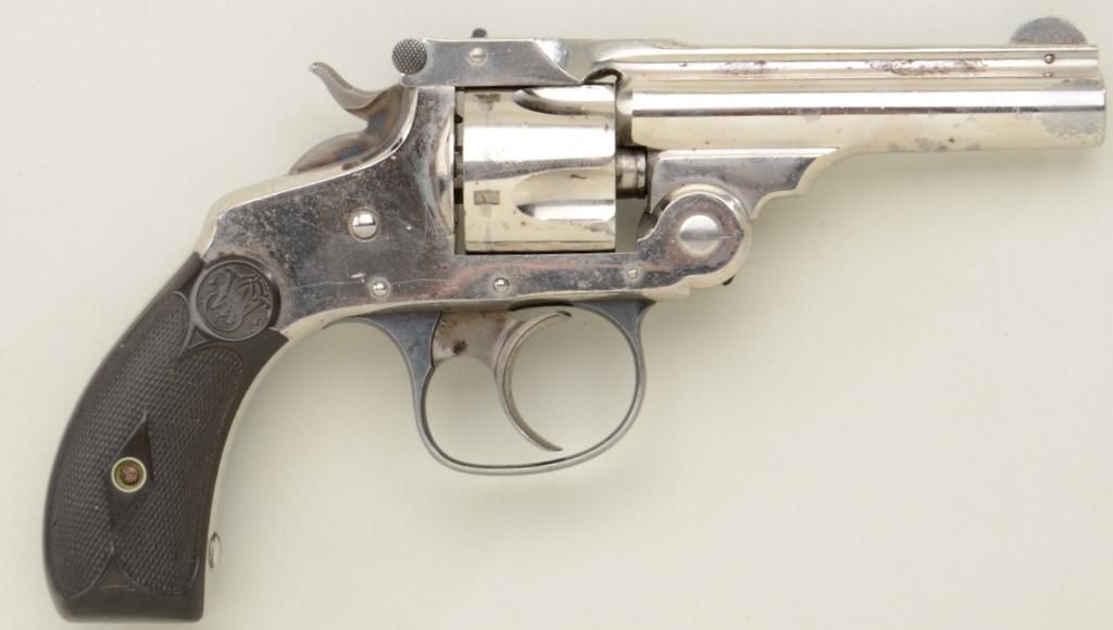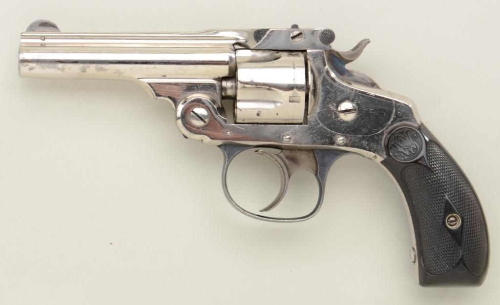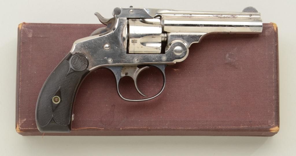 Smith & Wesson top break DA revolver, .32 cal., 3” barrel, nickel finish, checkered black hard rubber grips, #45141 (all matching visible numbers) with factory cardboard box showing correct end label. This gun is inoverall very good to near fine condition showing the majority of its original finish, very good bore, crisp action, very good markings, very good grips, considerable case colors on hammer and trigger; box is overallgood to very good with some slight scuffing and a couple dents, Directions for Use on inside of lid; box insert is overall good with some fraying, etc. From the Dr. John Hall Collection. Est.: $500-$1,000.