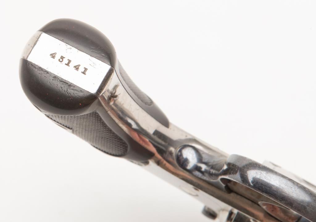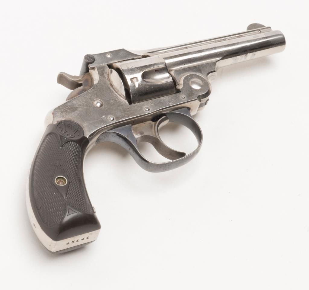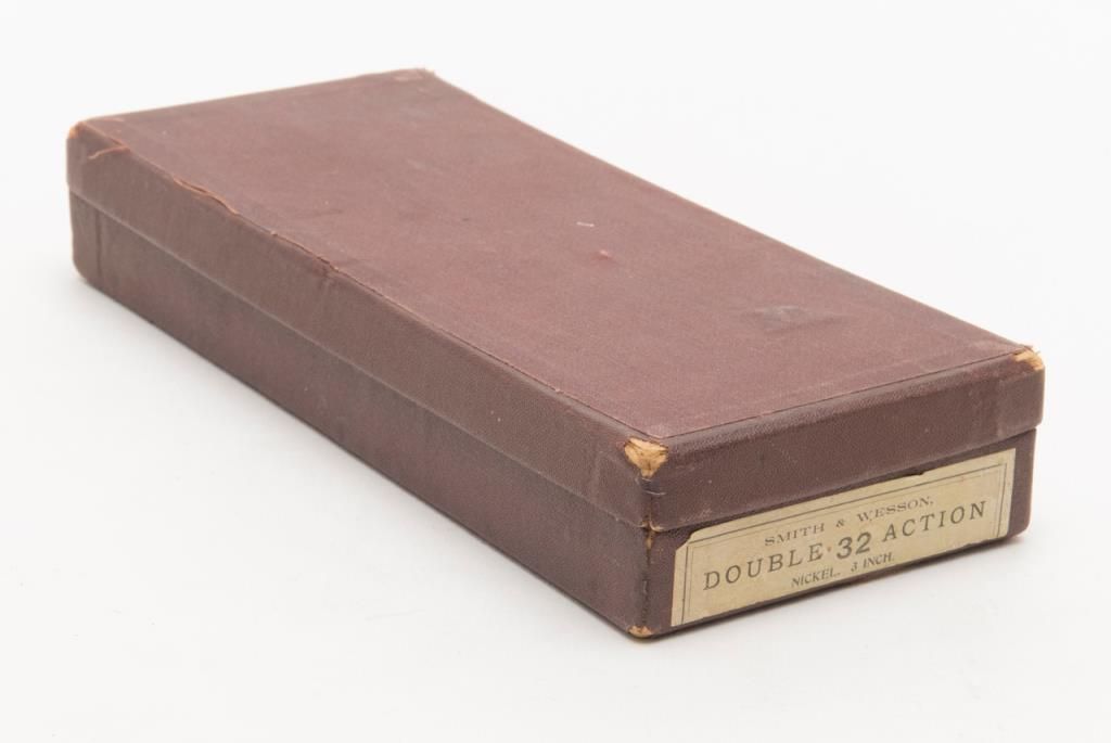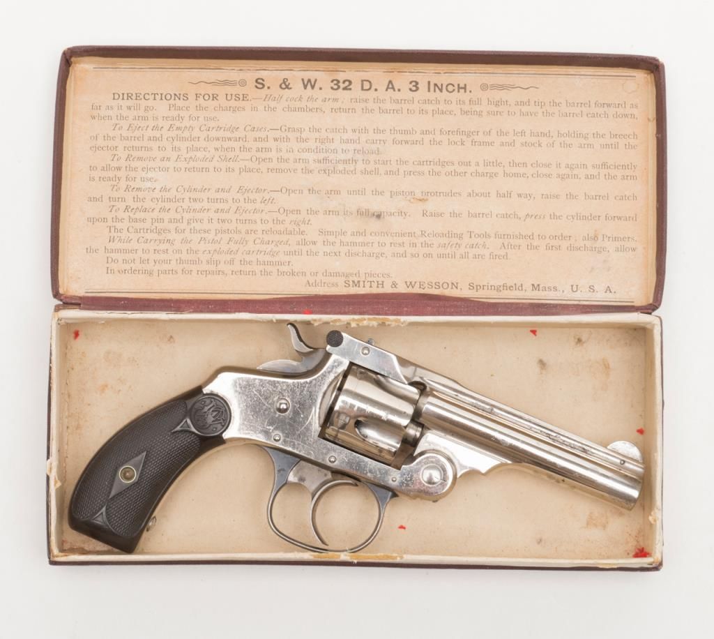 Smith & Wesson top break DA revolver, .32 cal., 3”  barrel, nickel finish, checkered black hard  rubber grips, #45141 (all matching visible  numbers) with factory cardboard box showing  correct end label. This gun is in overall verygood to near fine condition showing the majority  of its original finish, very good bore, crisp  action, very good markings, very good grips,  considerable case colors on hammer and trigger;  box is overall good to very good with some slightscuffing and a couple dents, Directions for Use on  inside of lid; box insert is overall good with  some fraying, etc.   Est.: $500-$1,000.