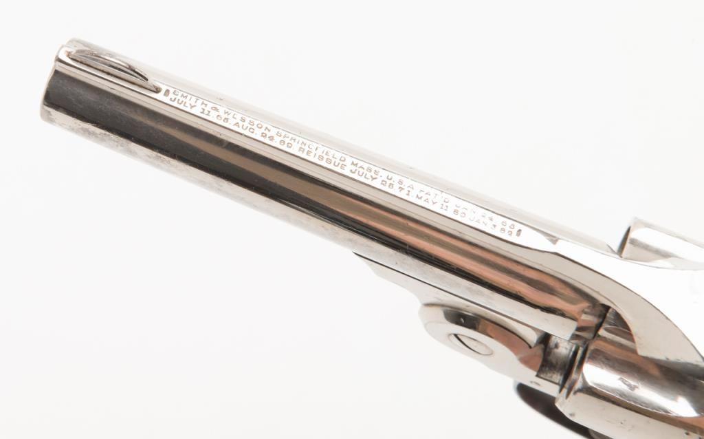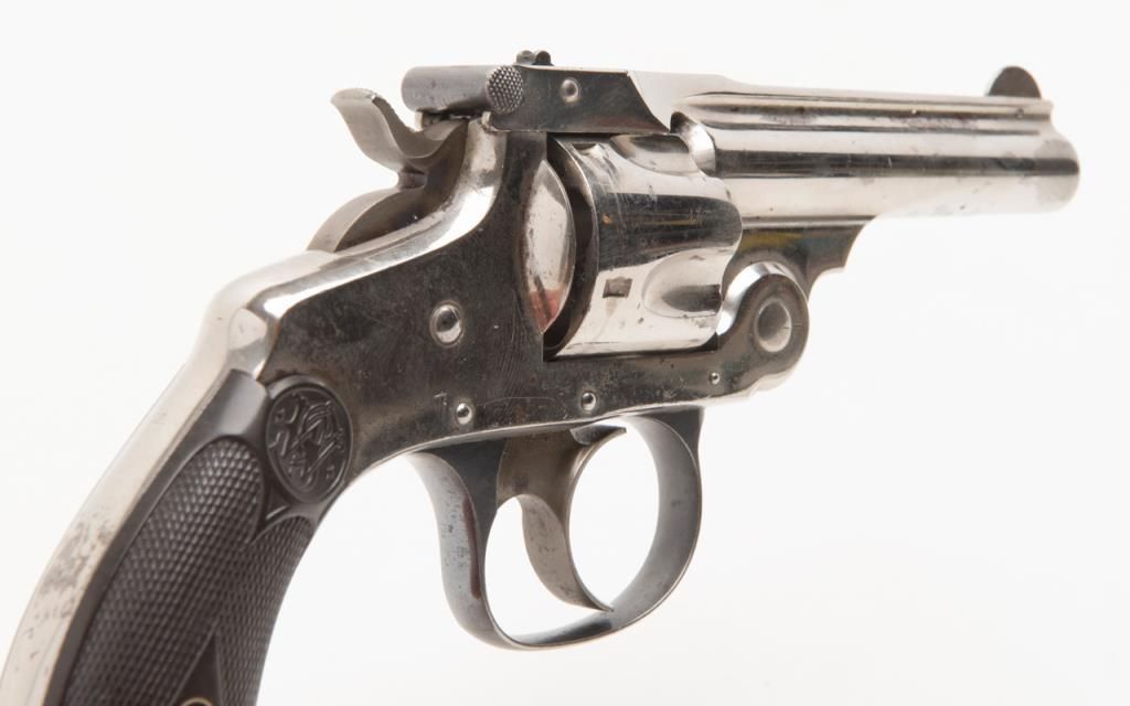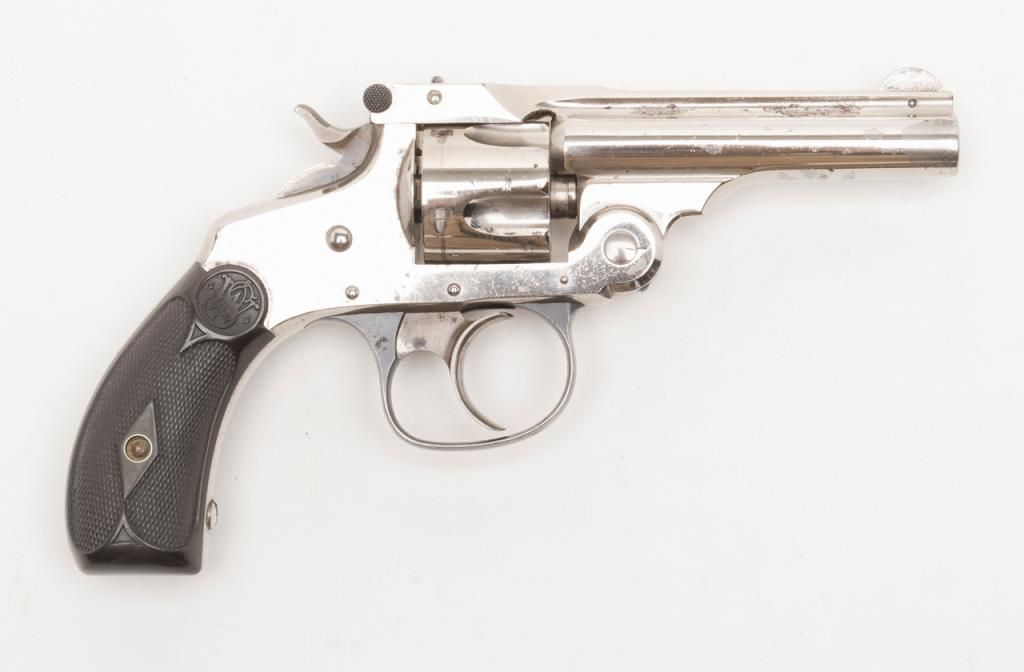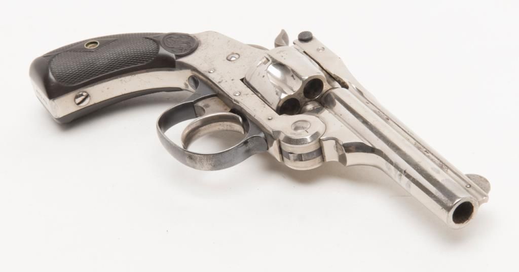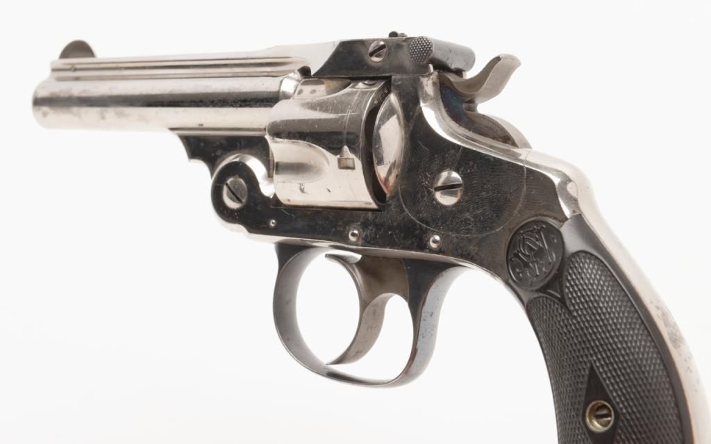 Smith & Wesson top break DA revolver, .32 cal., 3”  barrel, nickel finish, checkered black hard  rubber grips, #45141 (all matching visible  numbers) with factory cardboard box showing  correct end label. This gun is in overall verygood to near fine condition showing the majority  of its original finish, very good bore, crisp  action, very good markings, very good grips,  considerable case colors on hammer and trigger;  box is overall good to very good with some slightscuffing and a couple dents, Directions for Use on  inside of lid; box insert is overall good with  some fraying, etc.   Est.: $500-$1,000.
