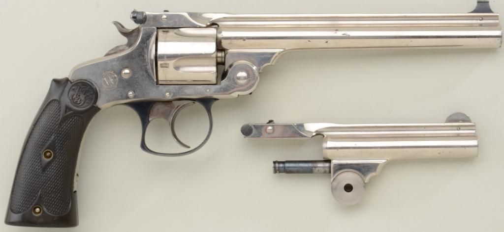 Smith & Wesson top break DA revolver, .38 S&W cal., with 6” target barrel and extra 3-1/4” barrel numbered to this gun, nickel finish, checkered black hard rubber extended length grips, #404429 (all matching visible serialnumbers including “8.13” stamped on the inside left flat of the butt strap under the grips, possibly indicating return to factory at that time for addition of second barrel assembly). This gun is in overall finecondition showing the majority of its factory finish remaining on all parts including the extra barrel; fine bores, action and markings, very good grips with a couple old dings from storage; would be interesting tofactory letter this gun. From the Dr. John Hall Collection. Est.: $750-$1,500.