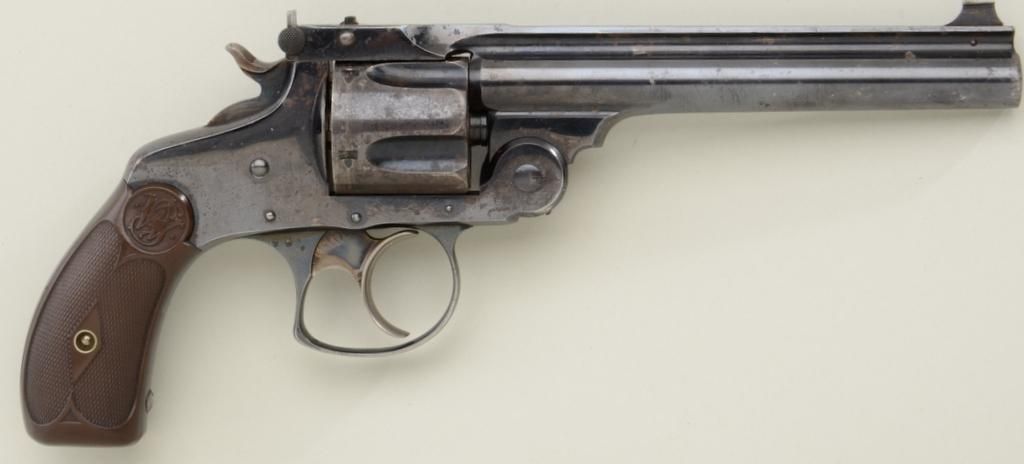Smith & Wesson top break DA revolver, .38 cal., 5” barrel, blue finish, checkered black hard rubber grips, #209524 (all matching visible numbers). This gun is in overall very good + condition showing considerableoriginal blue finish with scattered “flecking” spots spread over the revolver where the finish has been lost; some light scratching to the lock cover on the left side of the frame, several drag lines oncylinder, sights have been changed to target style, bore is overall good, action needs work, grips are good. From the Dr. John Hall Collection. Est.: $300-$600.